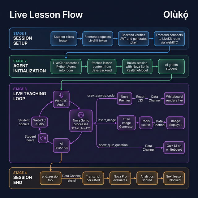 Olùkọ́ is built as a three-tier architecture a React frontend, a Java Spring Boot backend, and a Python voice agent all orchestrated through LiveKit Cloud for real-time WebRTC communication and AWS Bedrock for AI model inference.