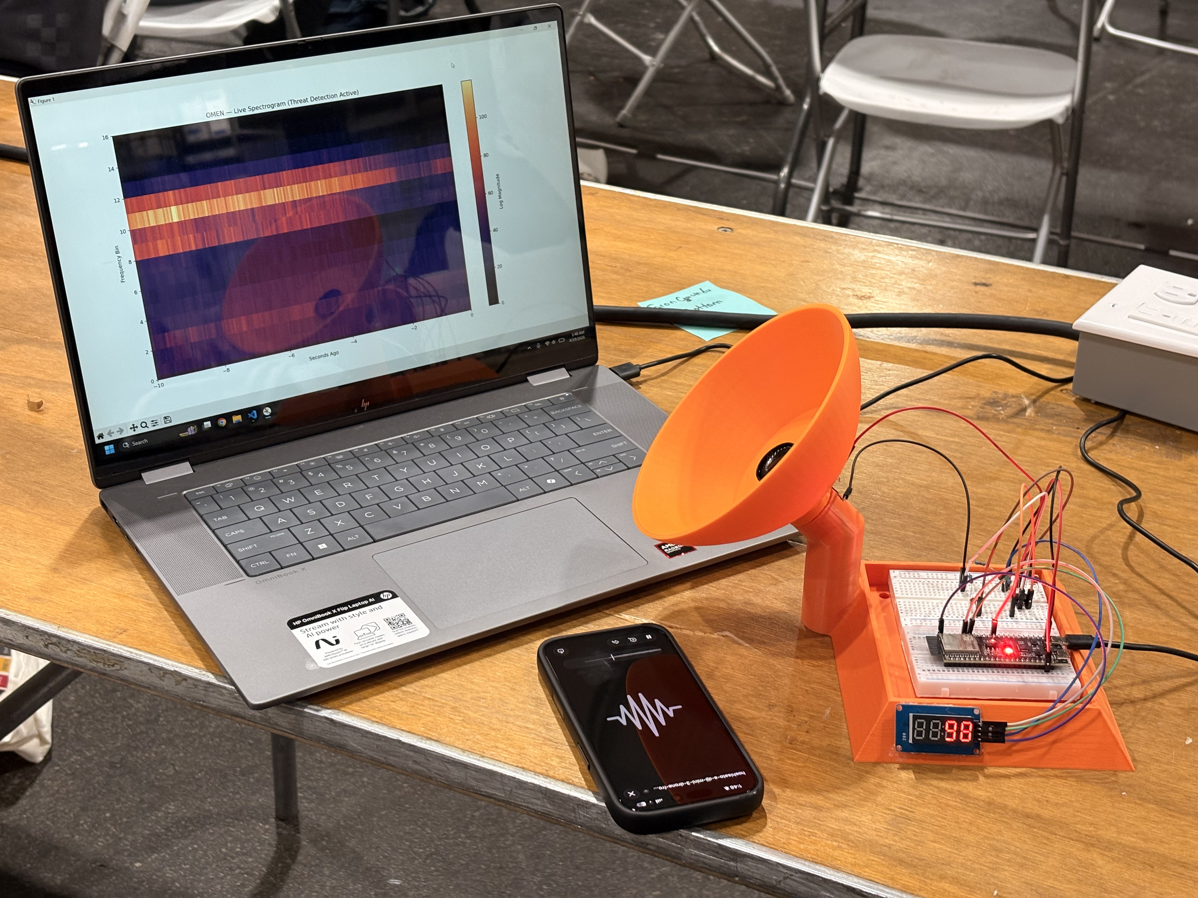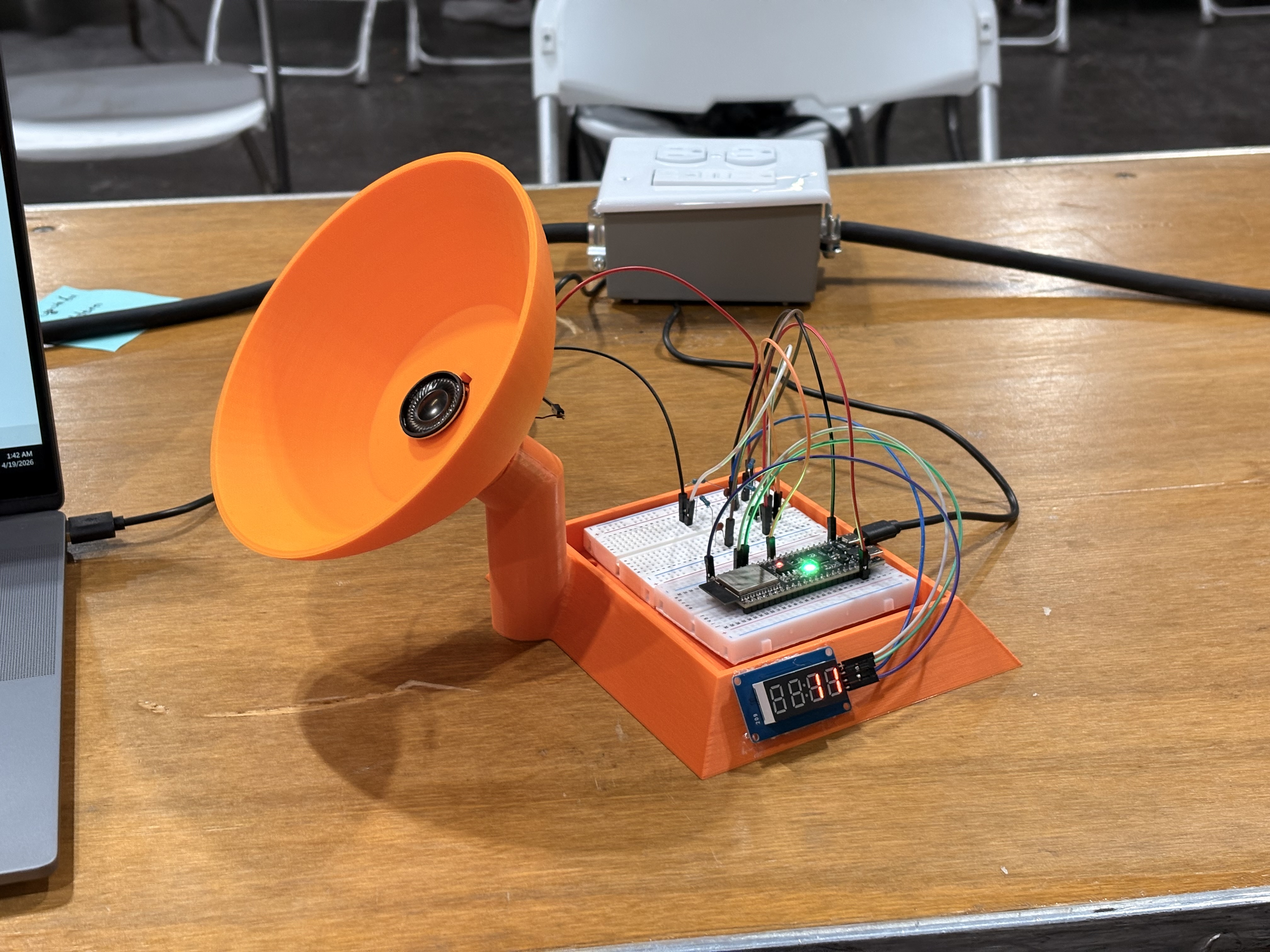 We kept this project focused entirely on functionality and affordability for war-struck regions. The total hardware cost was roughly $25, with the ESP32 development board being the most expensive piece, which could easily be swapped for cheaper hardware later. Makeshift Mic: We built a microphone from scratch using the acoustic properties of a magnetic speaker. Parabolic Reflector: To increase range, we built a calculated parabolic noise cone and placed our makeshift mic exactly at the focal point, acting as a physical amplifier to capture the maximum amount of directional sound.