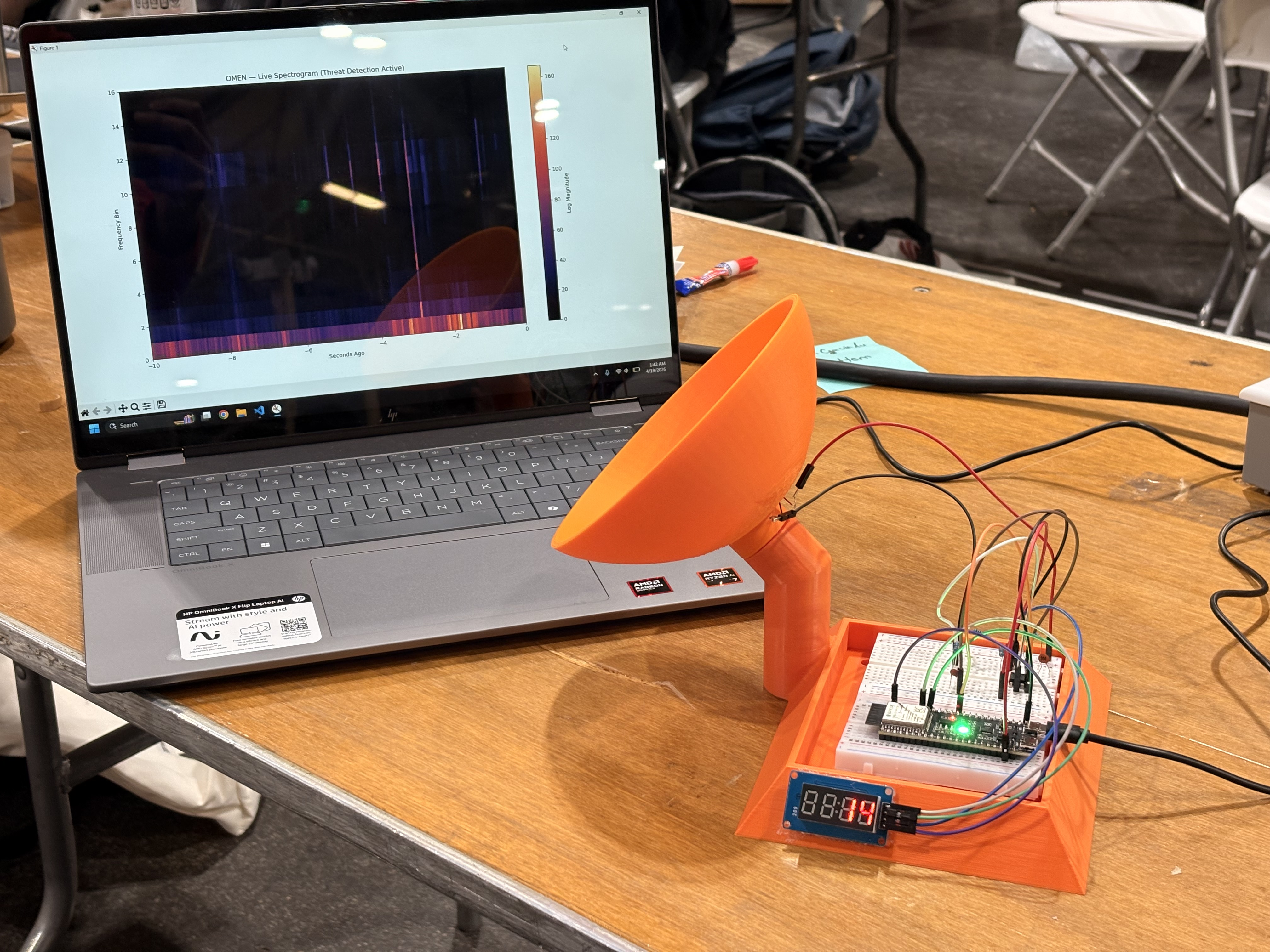 Live FFT: To run our model on minimal compute, the ESP32 performs a live Fast Fourier Transform on the incoming audio. This frequency analysis filters out background noise and isolates the specific frequency zones where drone propellers operate. Local Neural Network: That frequency data is fed into a specialized drone detection model trained on over 20,000 drone and "background" audio files. Running entirely on-device, the neural network calculates a real-time confidence percentage that a drone is nearby and displays it on the board. No internet, no cloud, no latency.