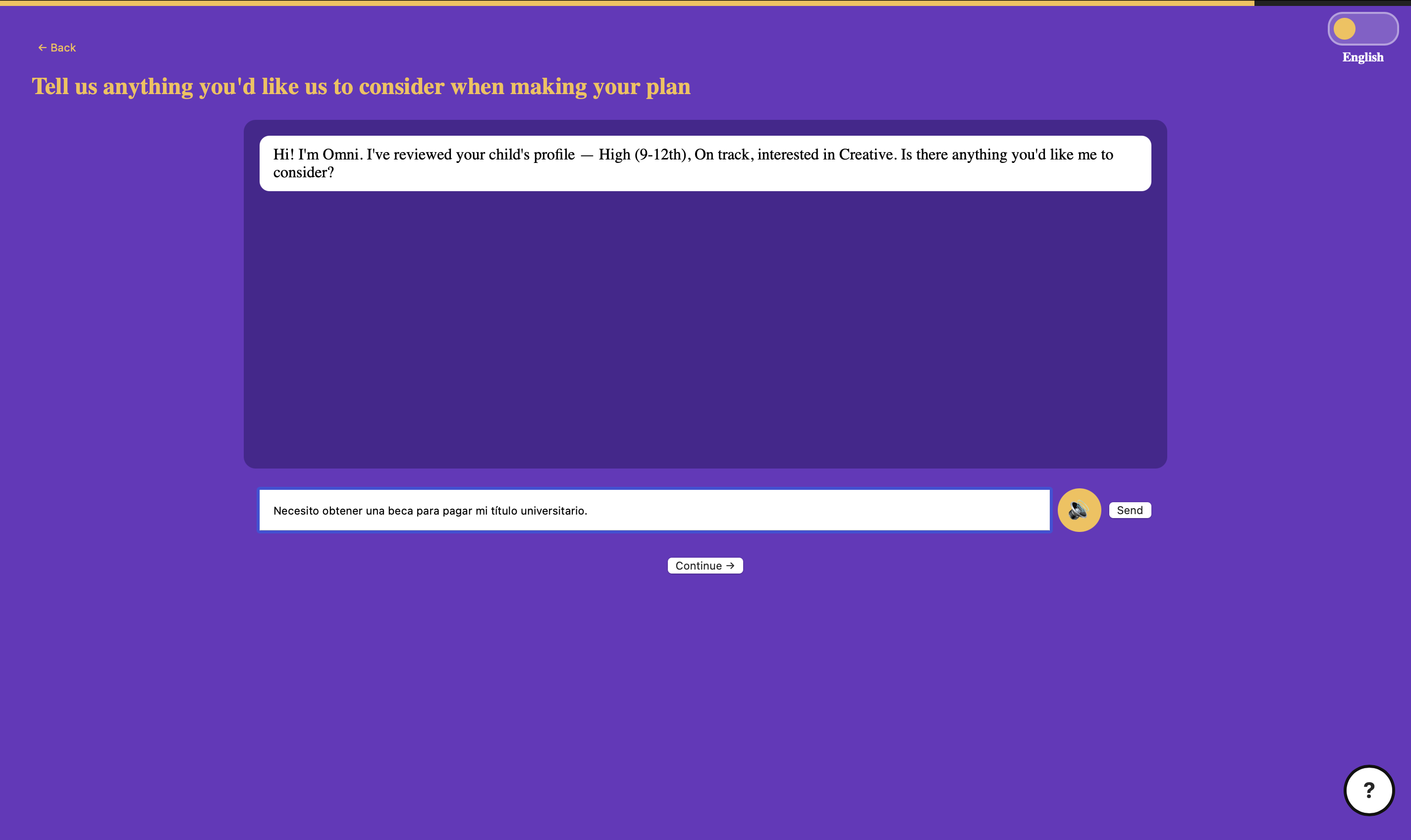 Omni is a guided educational roadmap assistant that helps Spanish-speaking families understand and navigate the U.S. school system in a structured, step-by-step way. It turns a student’s grade level, interests, and academic situation into: personalized academic paths clear tradeoffs between options (stress, rigor, outcomes) conversational refinement of decisions a final structured roadmap with next steps It also includes a voice layer so responses can be read aloud in English or Spanish using browser-based speech synthesis.