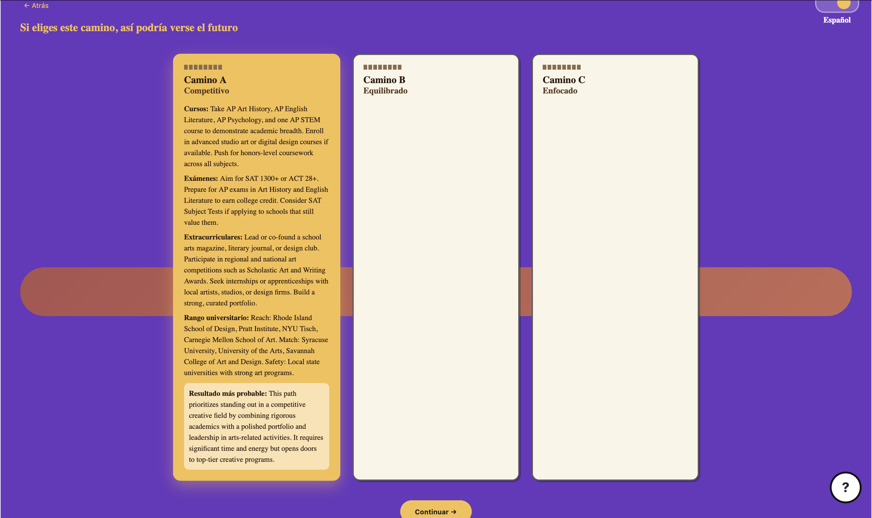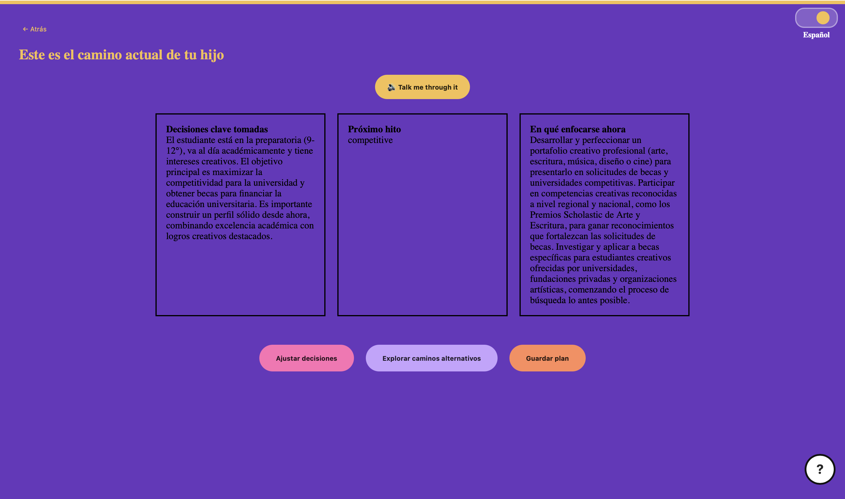 I’m proud that Omni prioritizes inclusivity and accessibility, rather than assuming all users already understand the U.S. education system. Instead of overwhelming users with information, it organizes academic decisions into structured, understandable pathways that support shared understanding within families. I’m especially proud of the design decisions behind Omni’s interface.The interface uses a vibrant, culturally inspired color palette designed to create a sense of familiarity and warmth, rather than the neutral, institutional aesthetic typical of education tools. I’m also proud that the experience supports both English and Spanish, and includes a voice feature that makes the system more accessible for users who prefer auditory learning or have different levels of reading fluency.