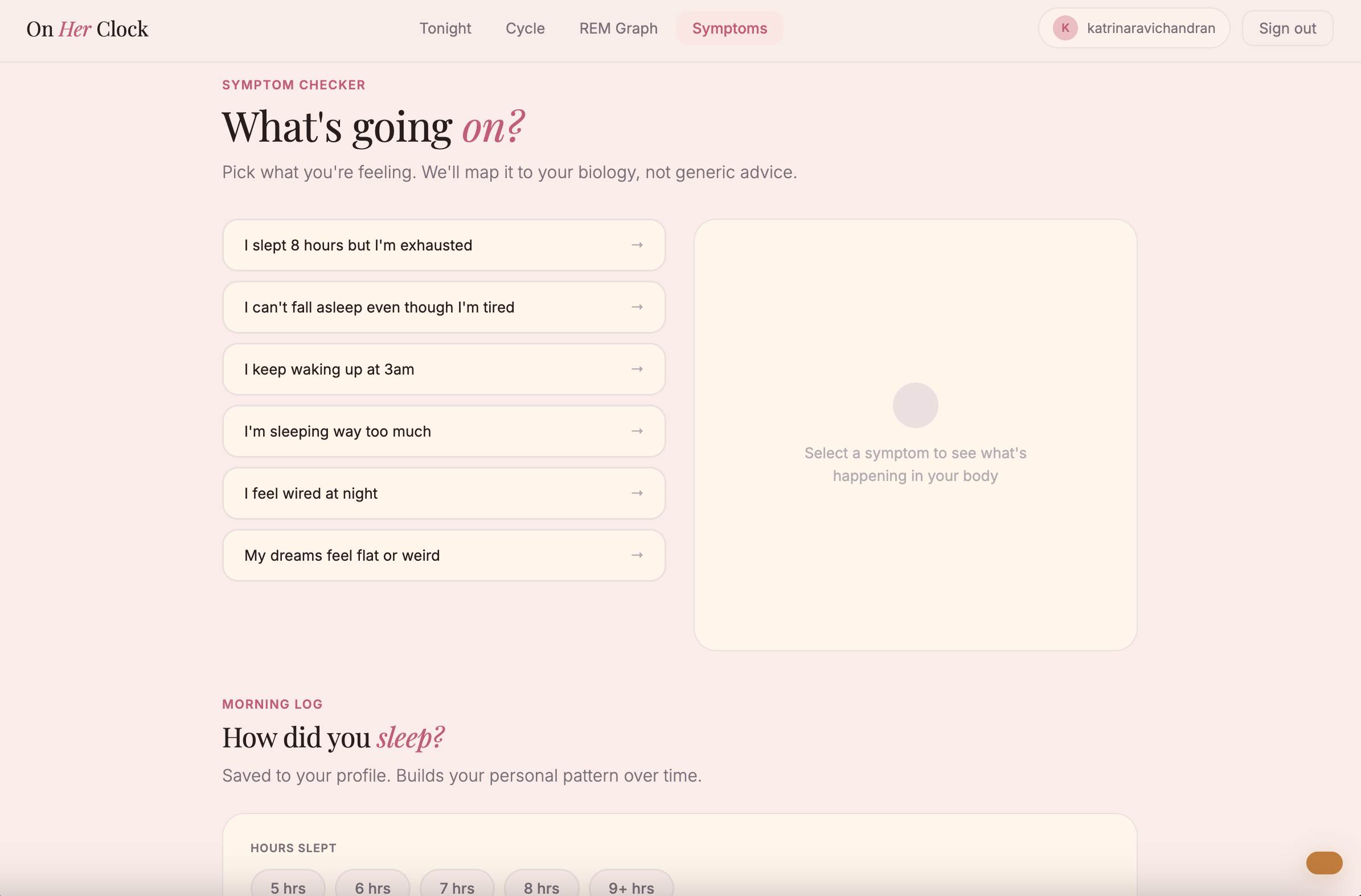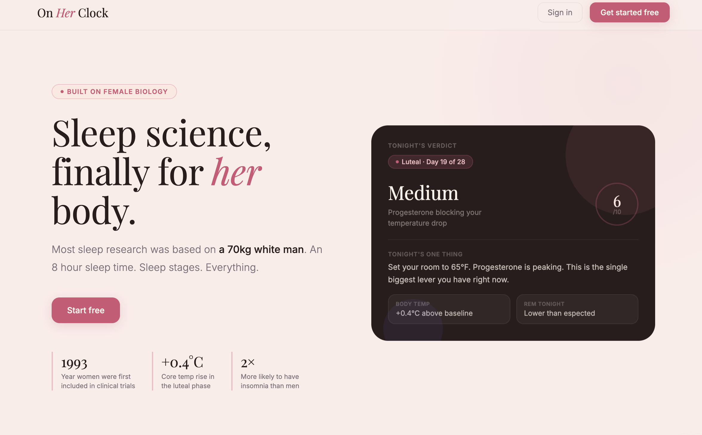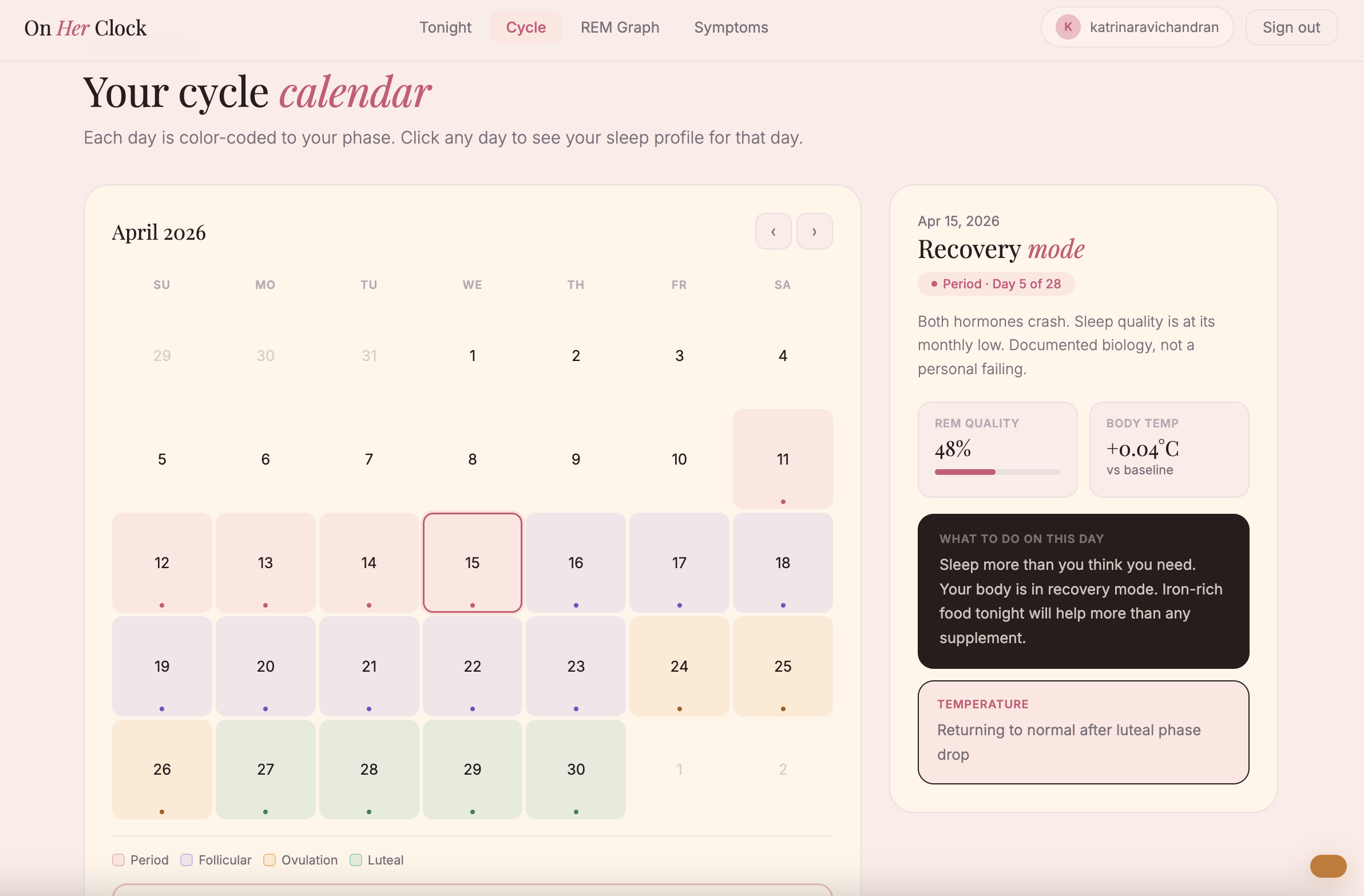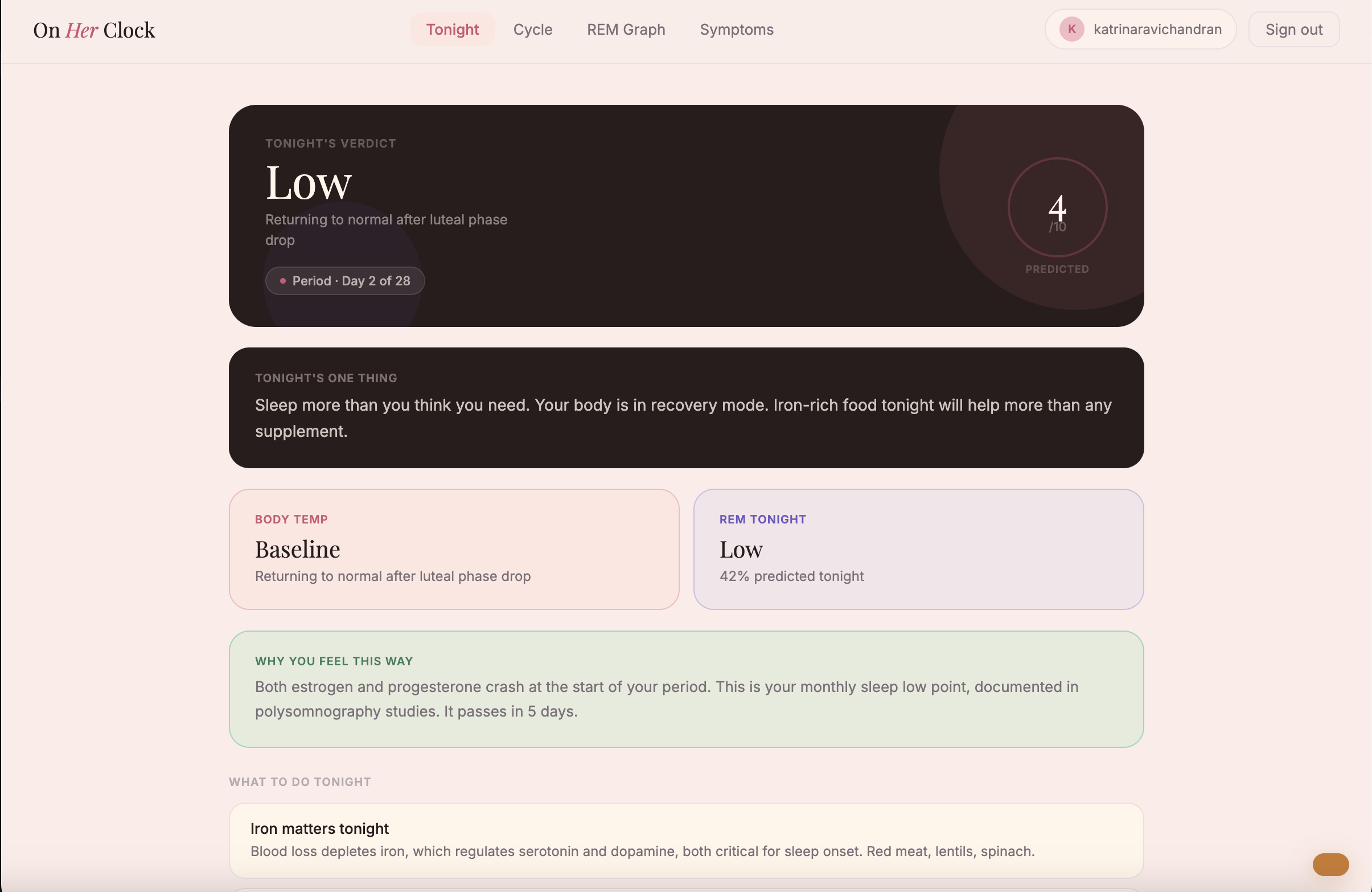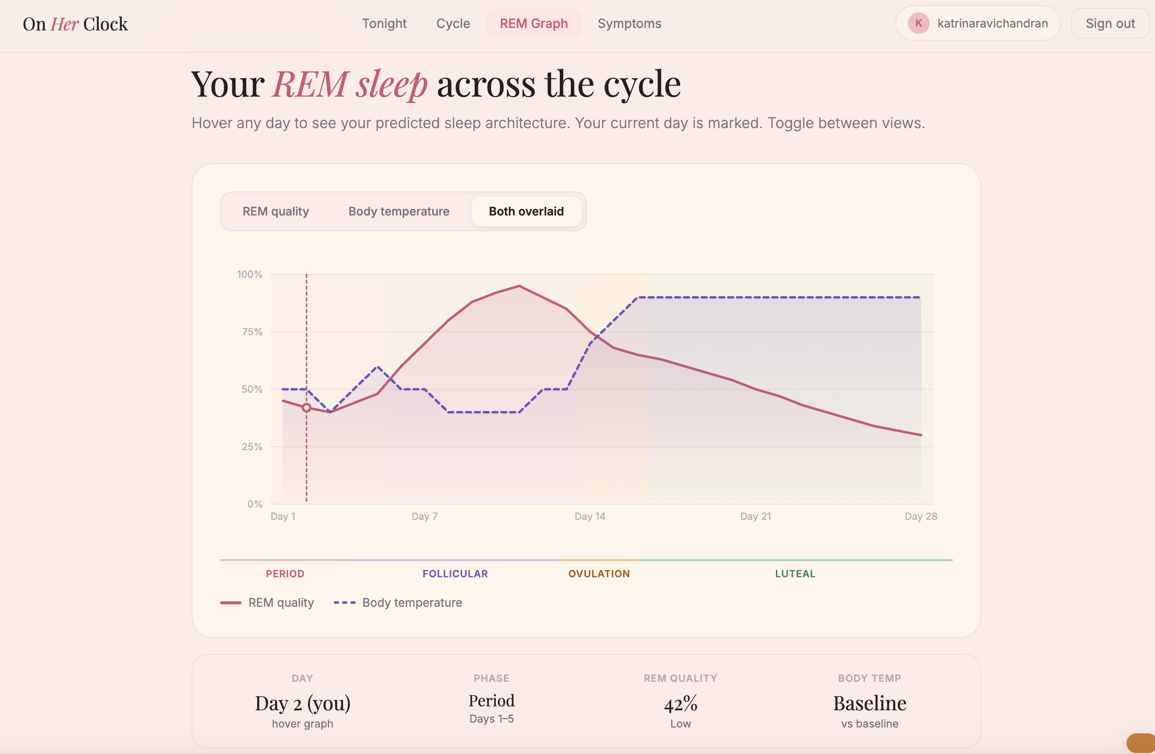 On Her Clock is a menstrual cycle-based sleep platform that is able to explain, predict, and personalize sleep based on female biology.