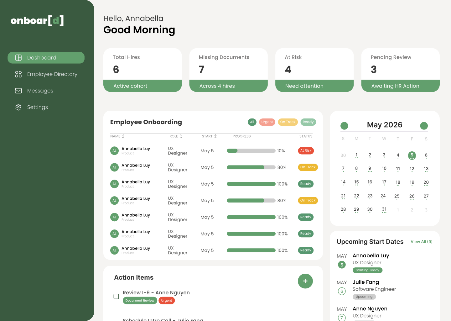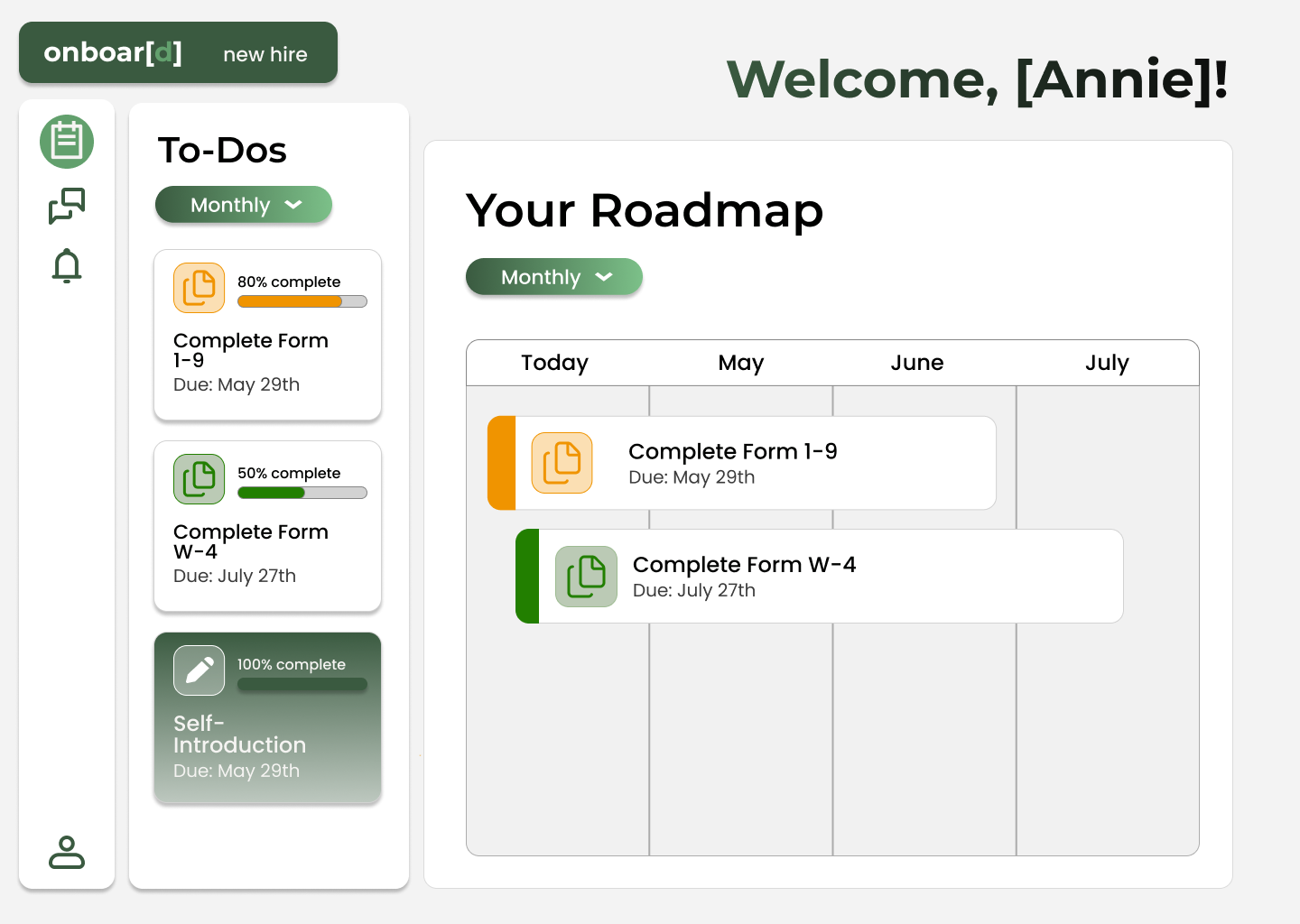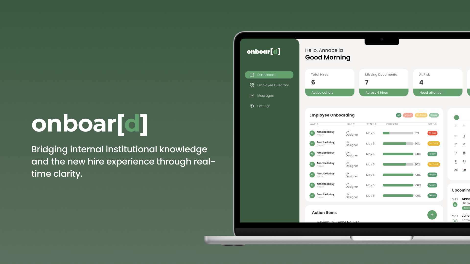 onboar[d] is a personal onboarding assistant that transforms scattered onboarding tasks into a guided experience. New hires get a centralized dashboard with step-by-step tasks, deadlines, and progress tracking, so they always know what to do next.