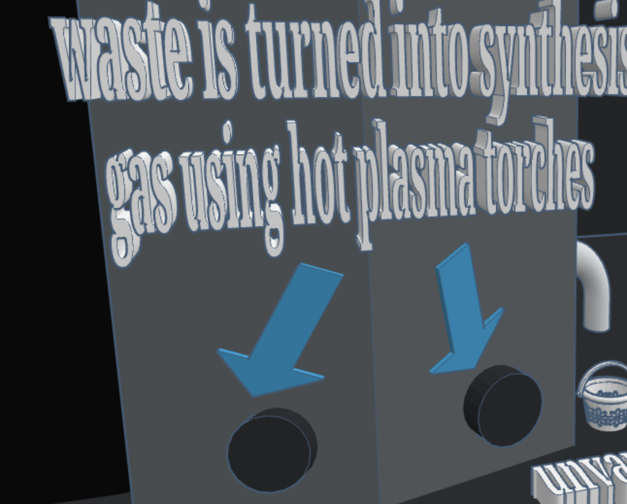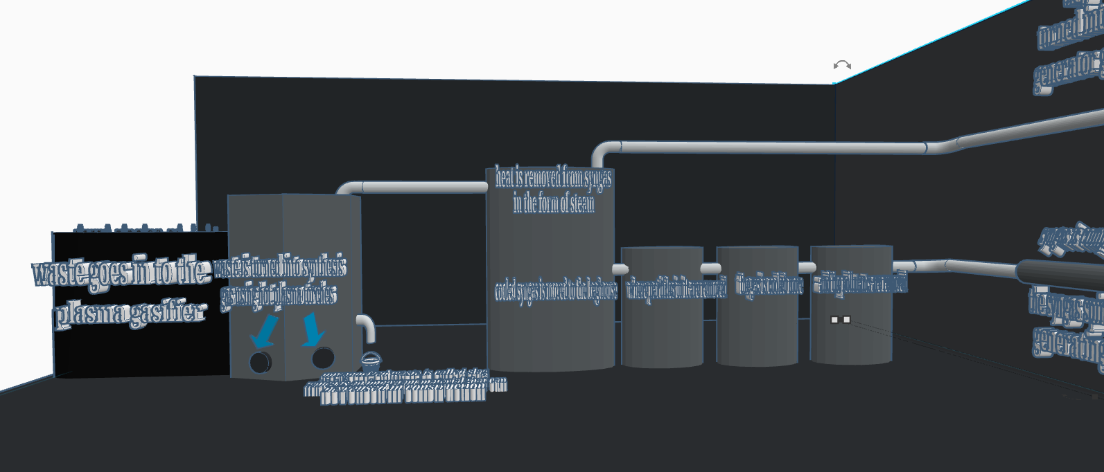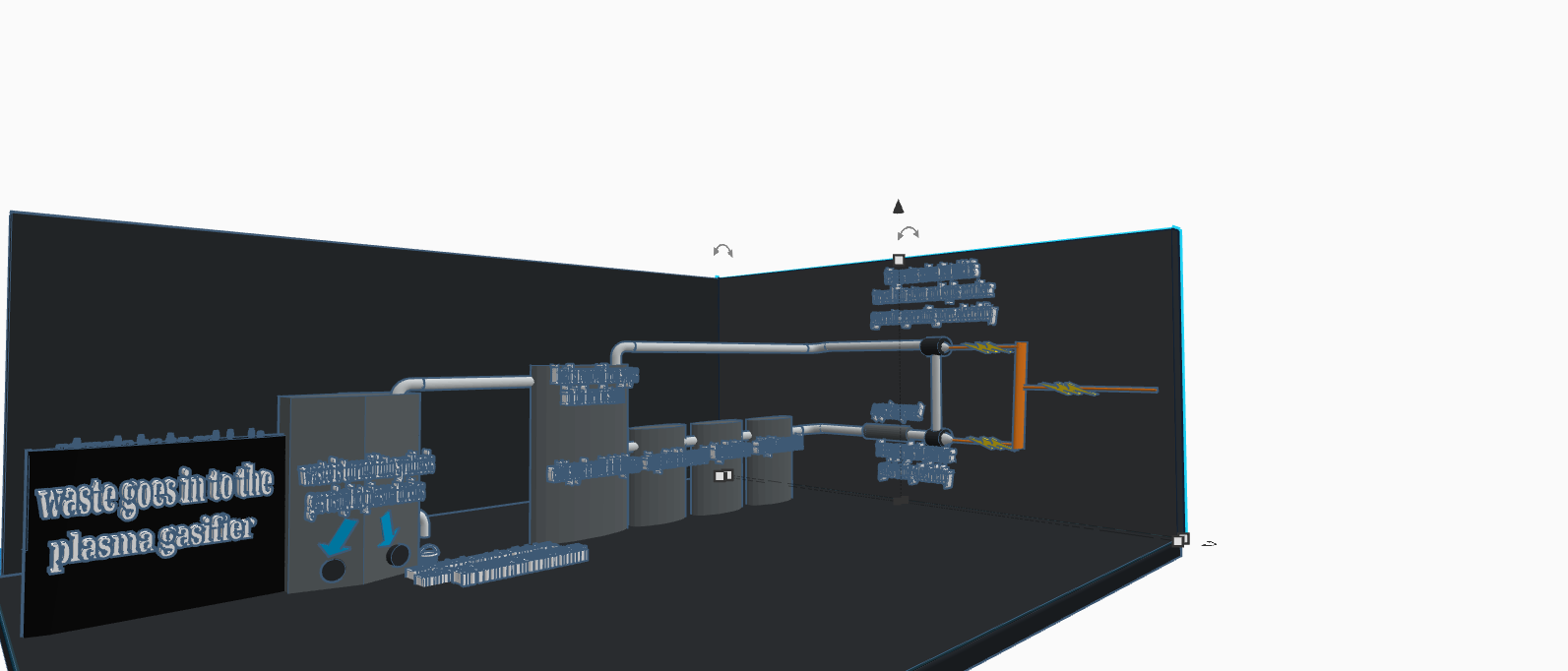 We used tinkercad, a 3d model site, as well as several informational articles to make a design of a compacted plant for a plasma gasifier. We researched each step of how syngas, the gas that is made by plasma gasification of trash, is cleaned and represented that in our 3d model. Finally we added a way to turn gas into energy by using a standard generator that is used in many other scenarios.