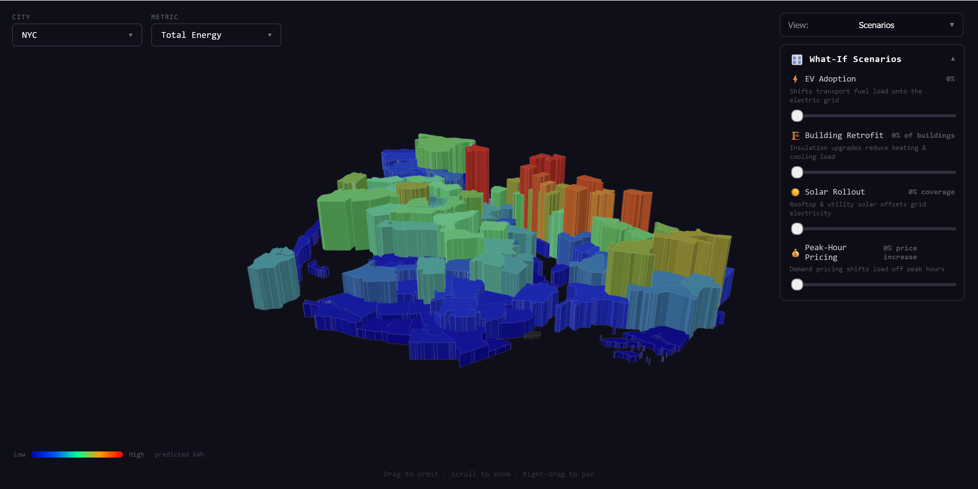 We’re proud of successfully replicating and validating a sophisticated academic model with real-world data across four major US cities: Chicago, NYC, Los Angeles, and Seattle. We achieved an exceptional R² accuracy of 0.988 for Chicago's electricity model, proving the methodology's effectiveness. Most importantly, we translated this complex analysis into a functional, interactive tool that makes abstract data tangible and actionable for city planners.