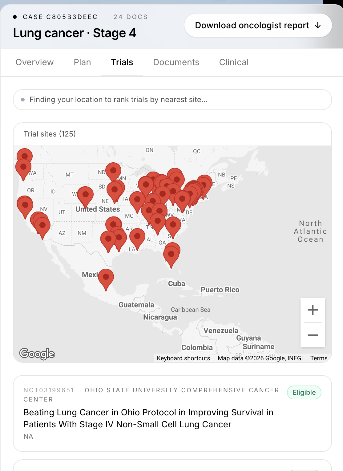 Oncologists are drowning. The average oncologist sees 50+ patients a week, each with a folder of PDFs, scans, and lab CSVs that have to be read, reconciled, and turned into a treatment plan that holds up against NCCN guidelines and the latest literature. Then they have to figure out if any active clinical trial fits the patient, and where the nearest site is. We watched a family member go through this on the patient side and realized the bottleneck wasn't medical knowledge, it was time and synthesis. We wanted to build the tool we wished existed for them: something that reads everything, reasons through it, and hands the oncologist a starting point in 90 seconds.