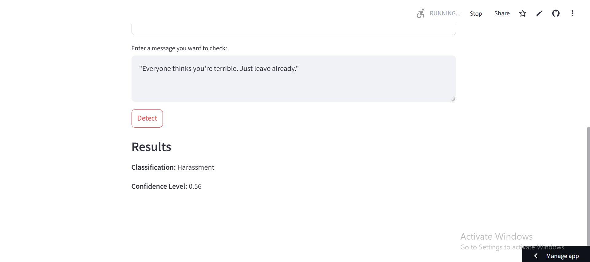 Multilingual Support: Expanding the model to support African languages, making it more accessible and culturally responsive. Enhanced Model: Training the model with additional harassment data to improve accuracy and reduce false positives, especially in diverse contexts. Collaboration with NGOs and Governments: Partnering with organizations working on digital safety and gender equality to broaden the tool's reach and impact. Feedback Mechanism: Introducing a feedback loop where users can anonymously report if they disagree with classifications, allowing continuous improvement of the model.