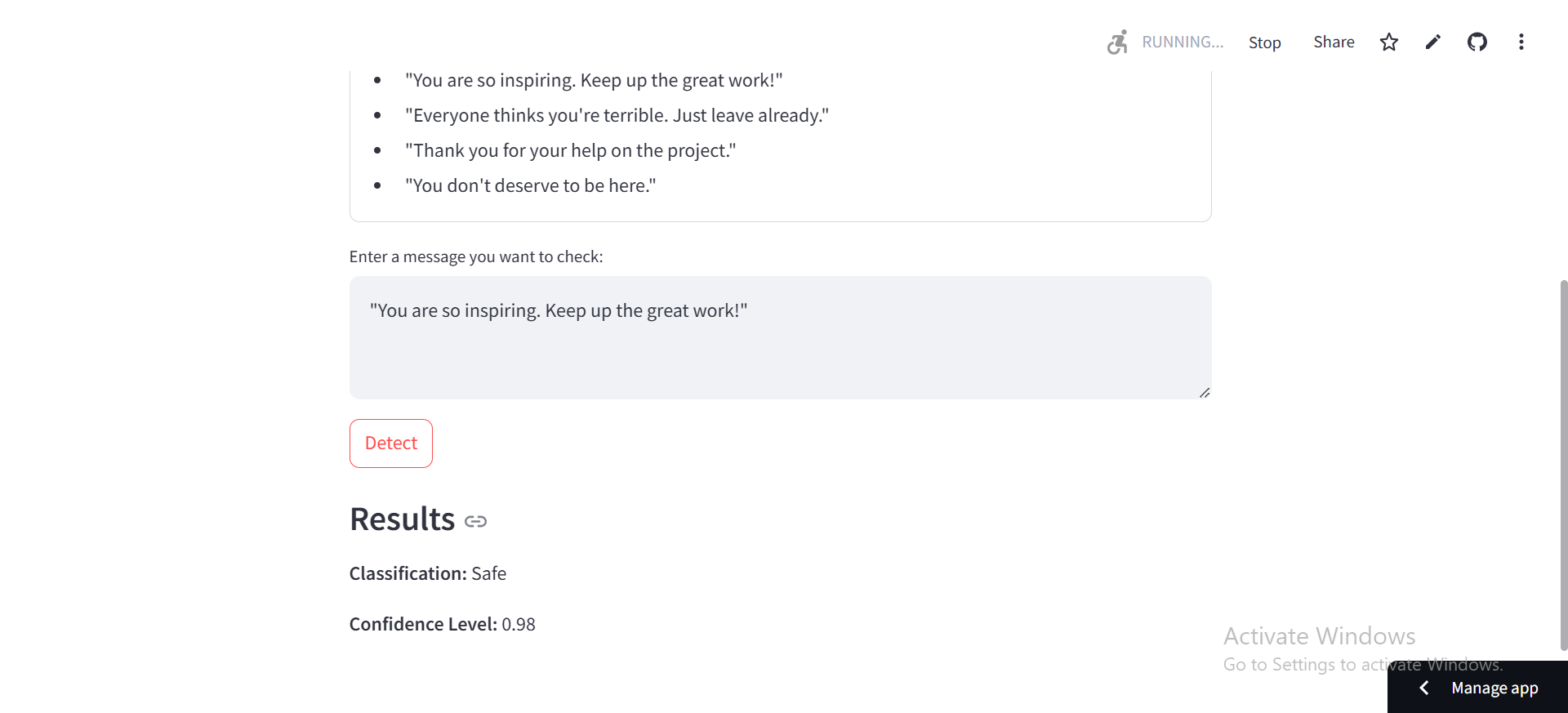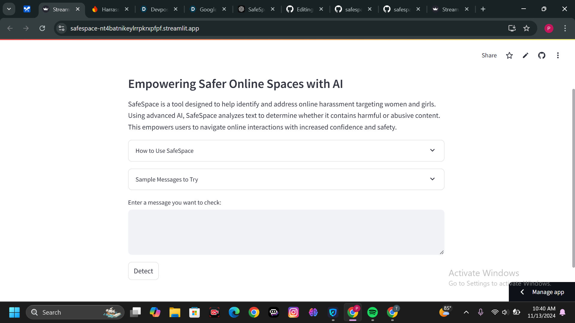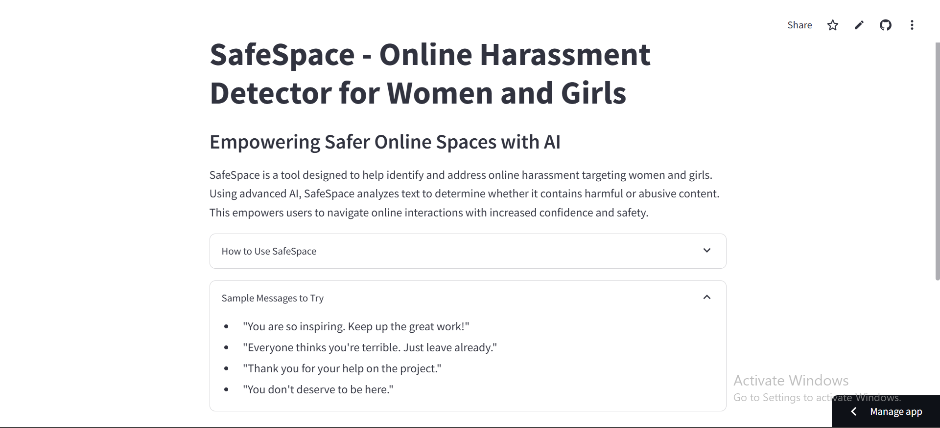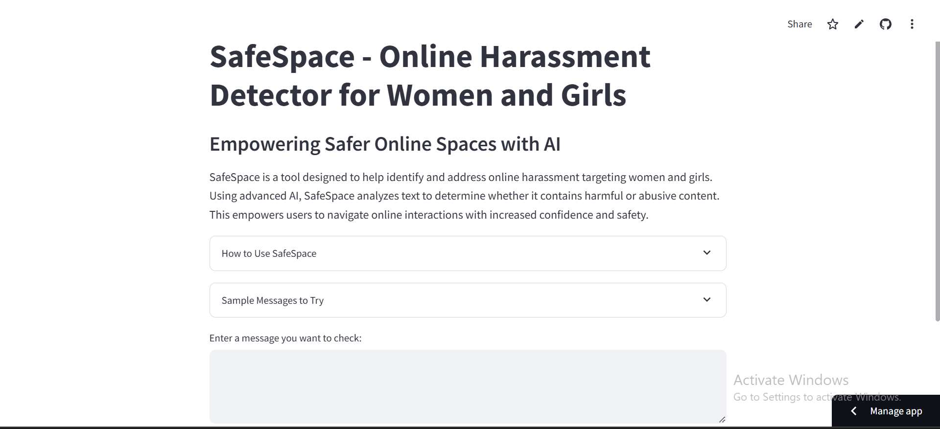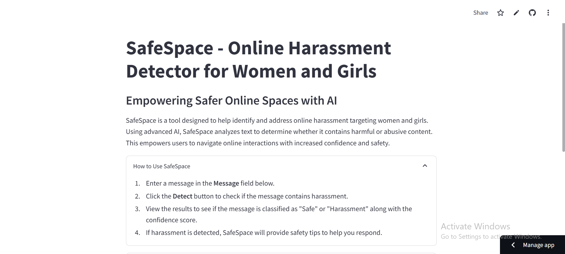 The Online Harassment Detector, SafeSpace, uses natural language processing (NLP) to classify text as either “Safe” or “Harassment.” By analyzing content with high accuracy, it provides users with immediate feedback, a confidence score, and supportive guidance if harassment is detected. Additionally, the system saves these reports securely in a Firebase database, allowing for potential tracking and analysis of harassment patterns while protecting user privacy.