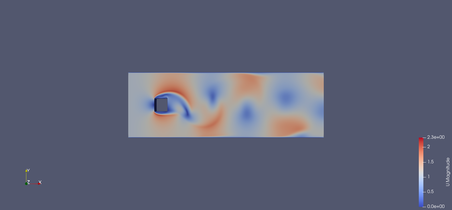 k-omega SST simulation showing vortex shedding past a rectangular obstacle.