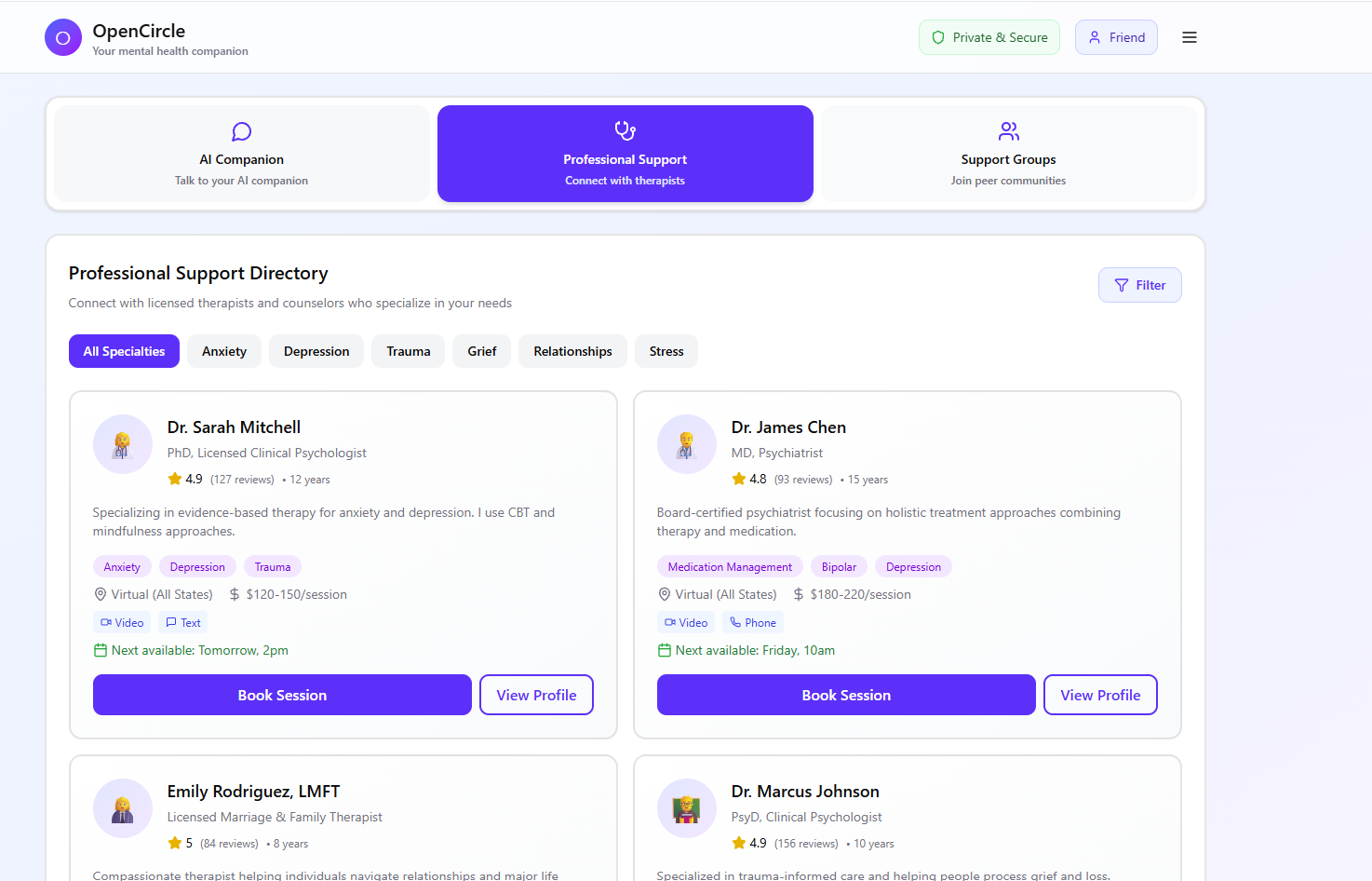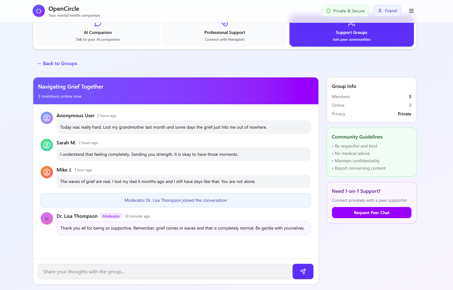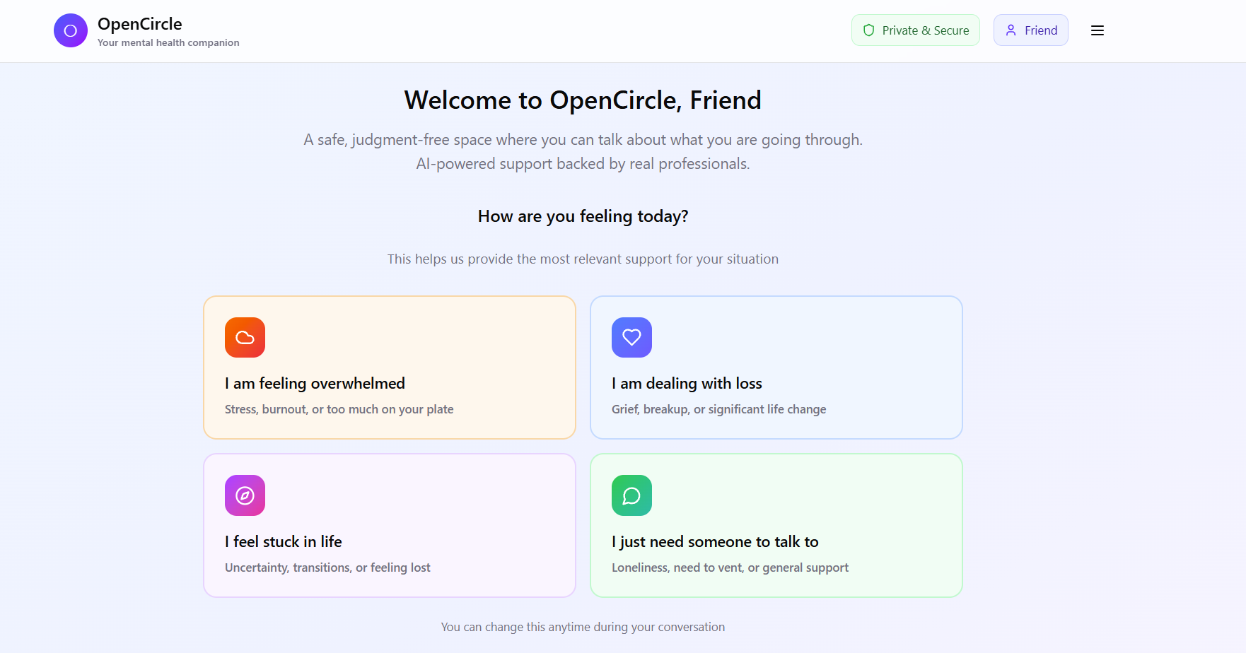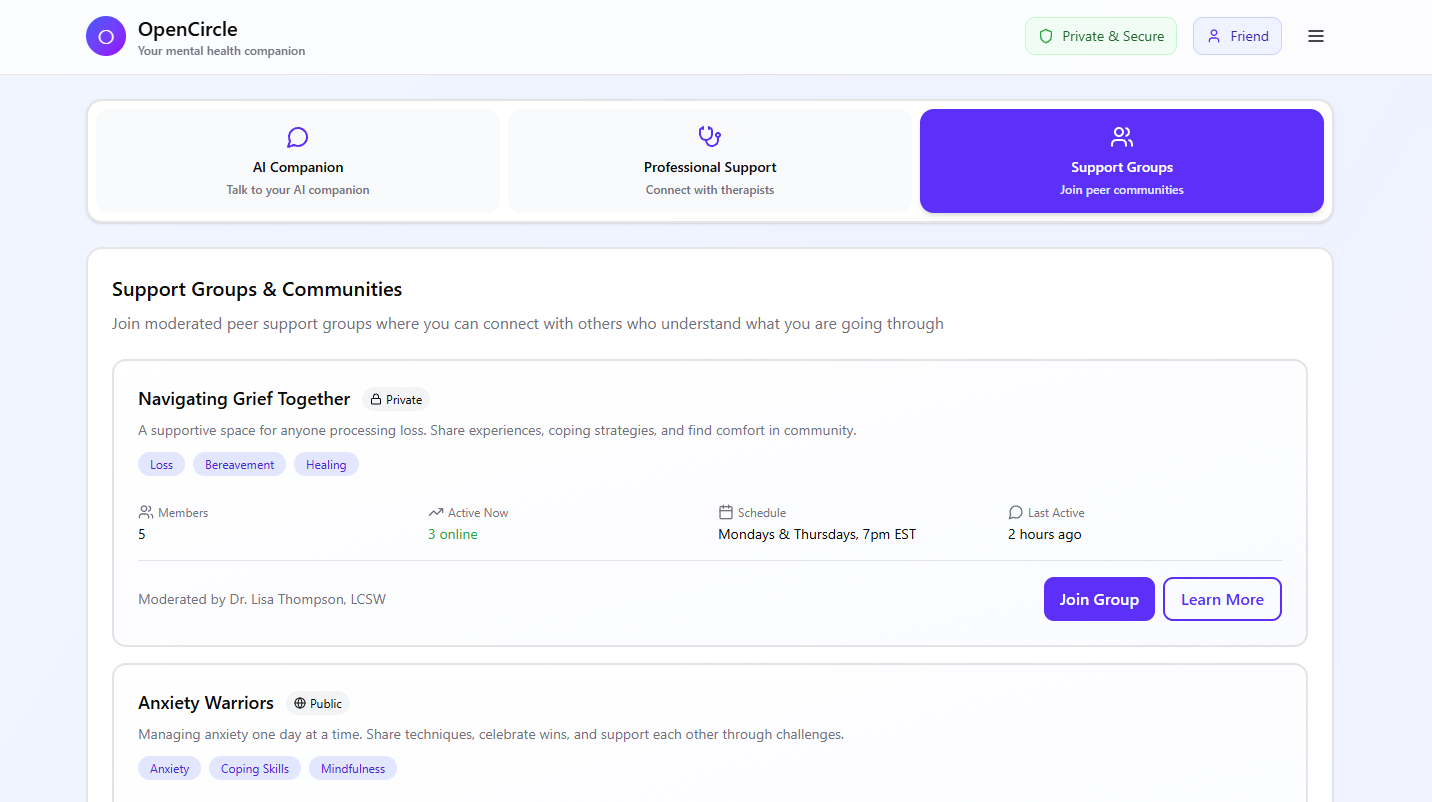 OpenCircle provides an AI companion that blends personalized emotional support, peer connection, and access to professionals. When you first join, you can choose details like your age, language, location, and preferred support you're looking for. This information helps the AI adapts its tone, vocabulary and empathy level to match your age. From there, you can explore different types of support. You can talk with an AI designed to help you reflect and understand what you're feeling, even if you don't know how to put it in your words. You can connect and chat with others going through similar experiences through the peer connections. If you're ready for professional help, you can browse and connect with the therapists near you based on your locations.