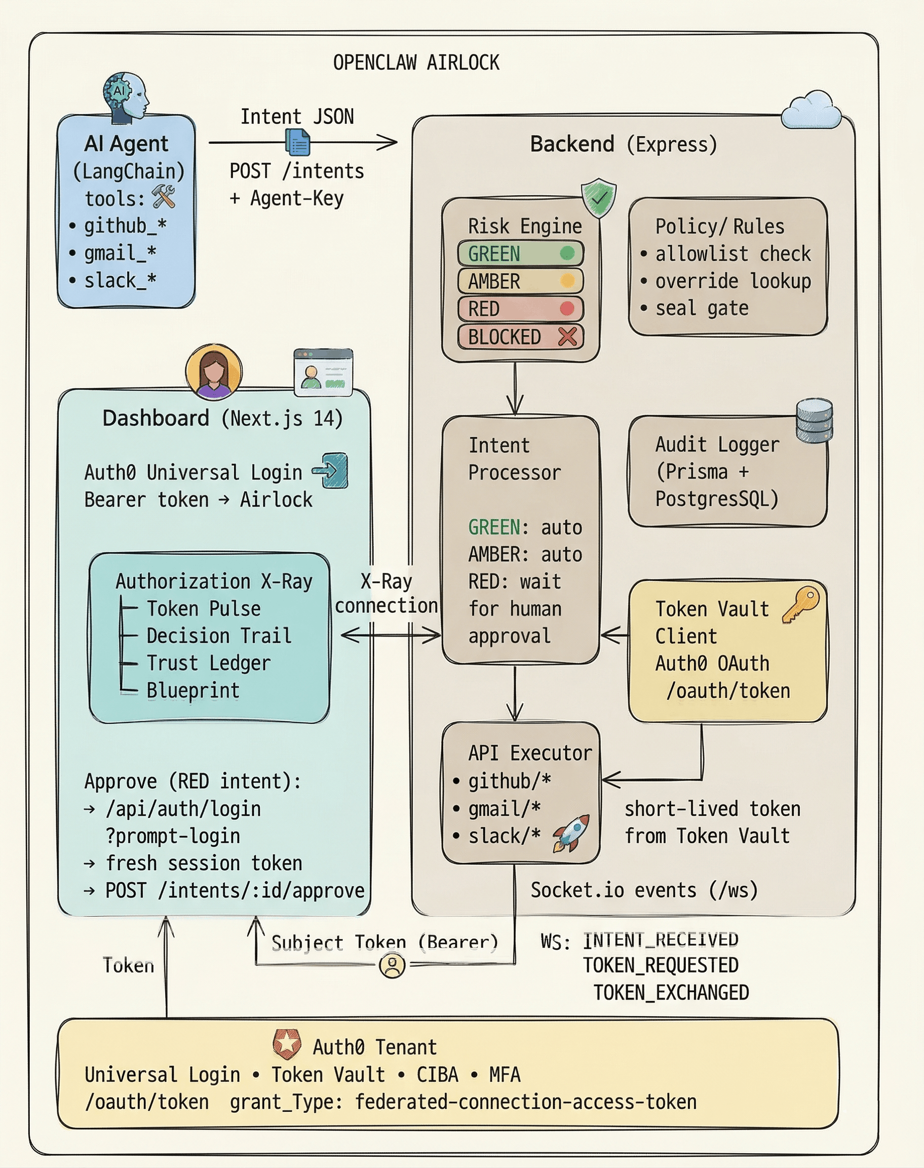 That realization changed the whole project. Instead of letting the agent call provider APIs directly, we redesigned the system around intents. The agent declares what it wants to do, the Airlock classifies the action by risk, and only then do we ask Auth0 Token Vault for a delegated credential. In other words, we stopped treating credentials as static configuration and started treating them as something that should be issued dynamically, at the last possible moment, for one specific action.