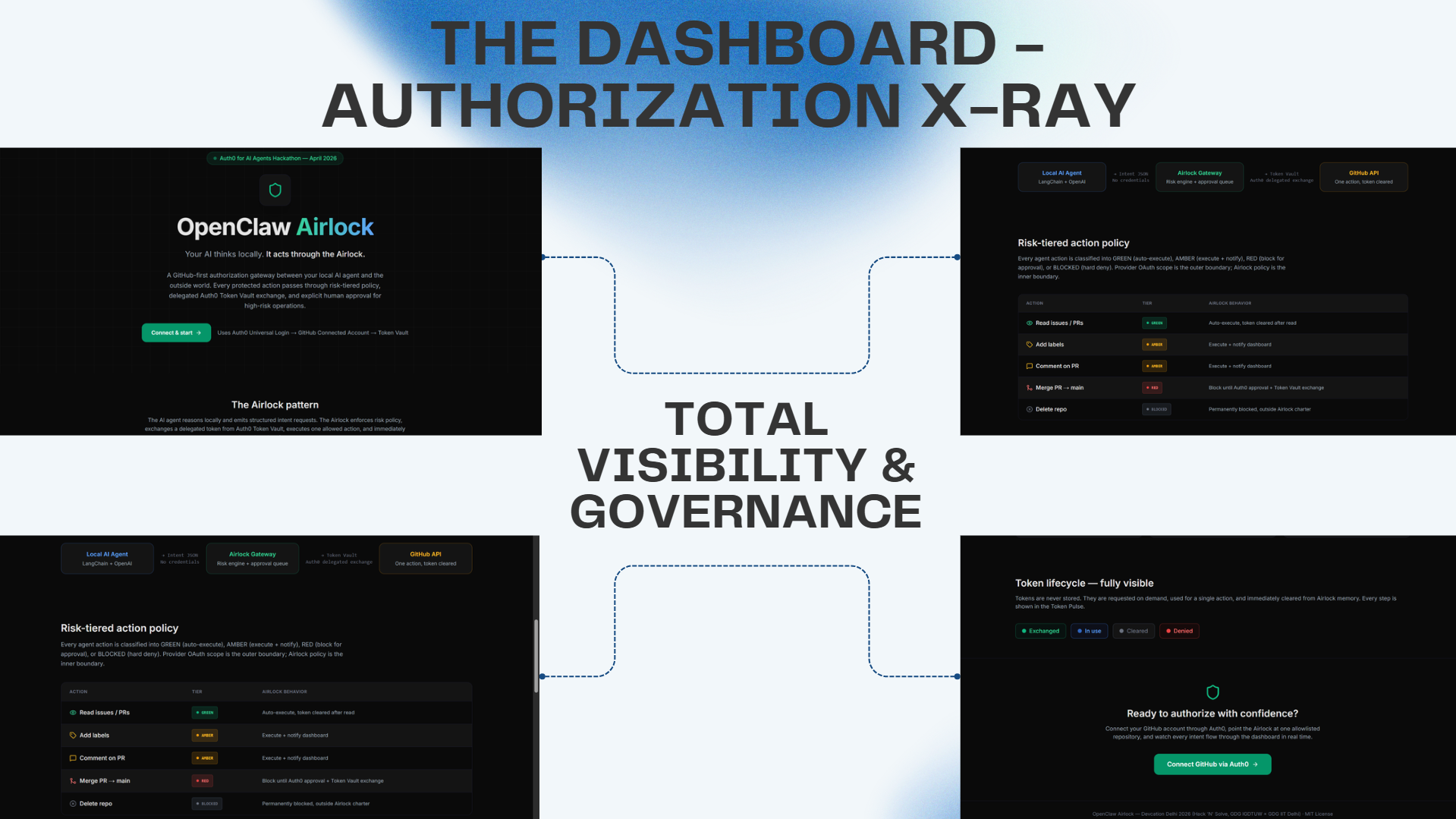 We built a full working chain: agent -> Airlock -> Auth0 Token Vault -> GitHub, with no long-lived GitHub token stored in the application layer. We also built a live dashboard that exposes every authorization decision in real time, including token requested, token exchanged, action executed, and token cleared.