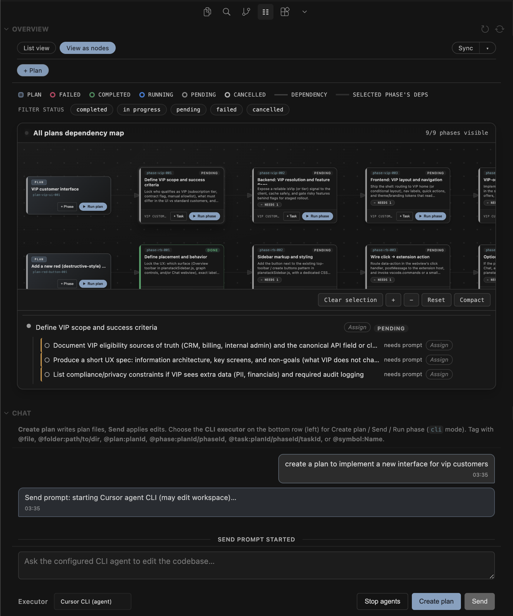 Running a phase builds a prompt and hands it off. Default path is the Cursor CLI agent; there's also a clipboard path if you'd rather paste straight into Composer, plus hooks for other runners later. Phase dependencies get checked when the file loads: no cycles, no pointing at ids that don't exist, no "depends on myself" nonsense.