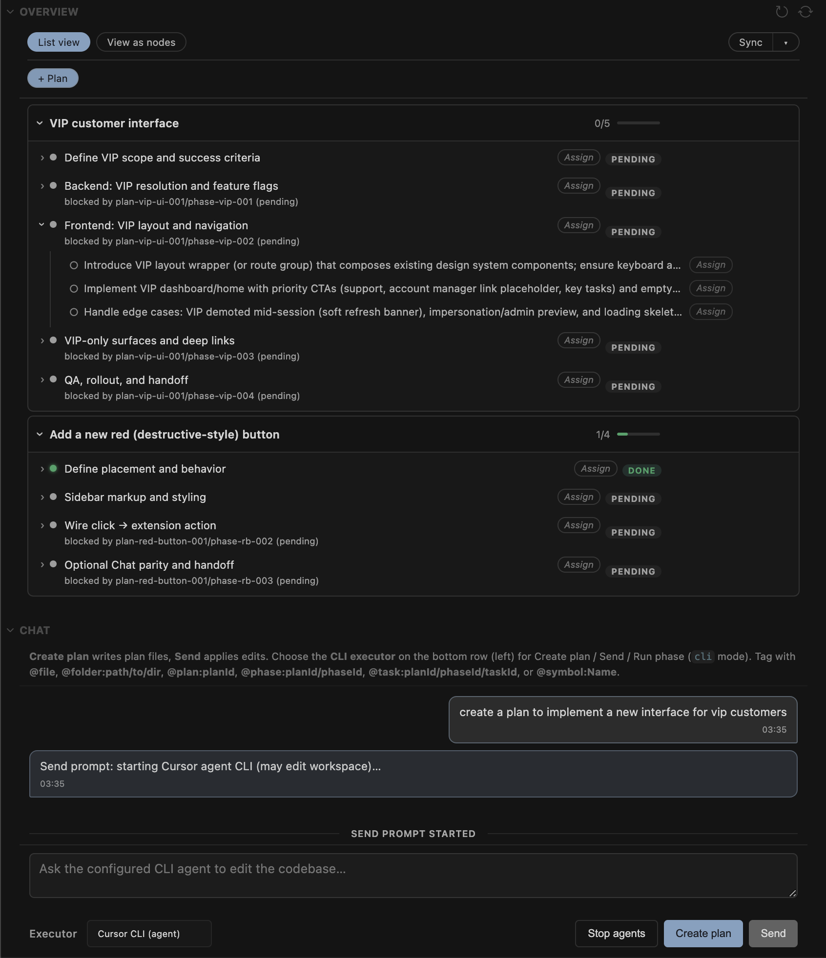 The sidebar shows the tree, badges for state, quick assignee edits, and buttons on each node. The chat panel does two jobs: help you draft a plan from a rough goal, and show execution as it happens (stdout/stderr from whatever runner you pointed at). Mentions (@file, @phase, @task, @symbol) pull in context with a fixed token budget so the prompt doesn't quietly balloon.