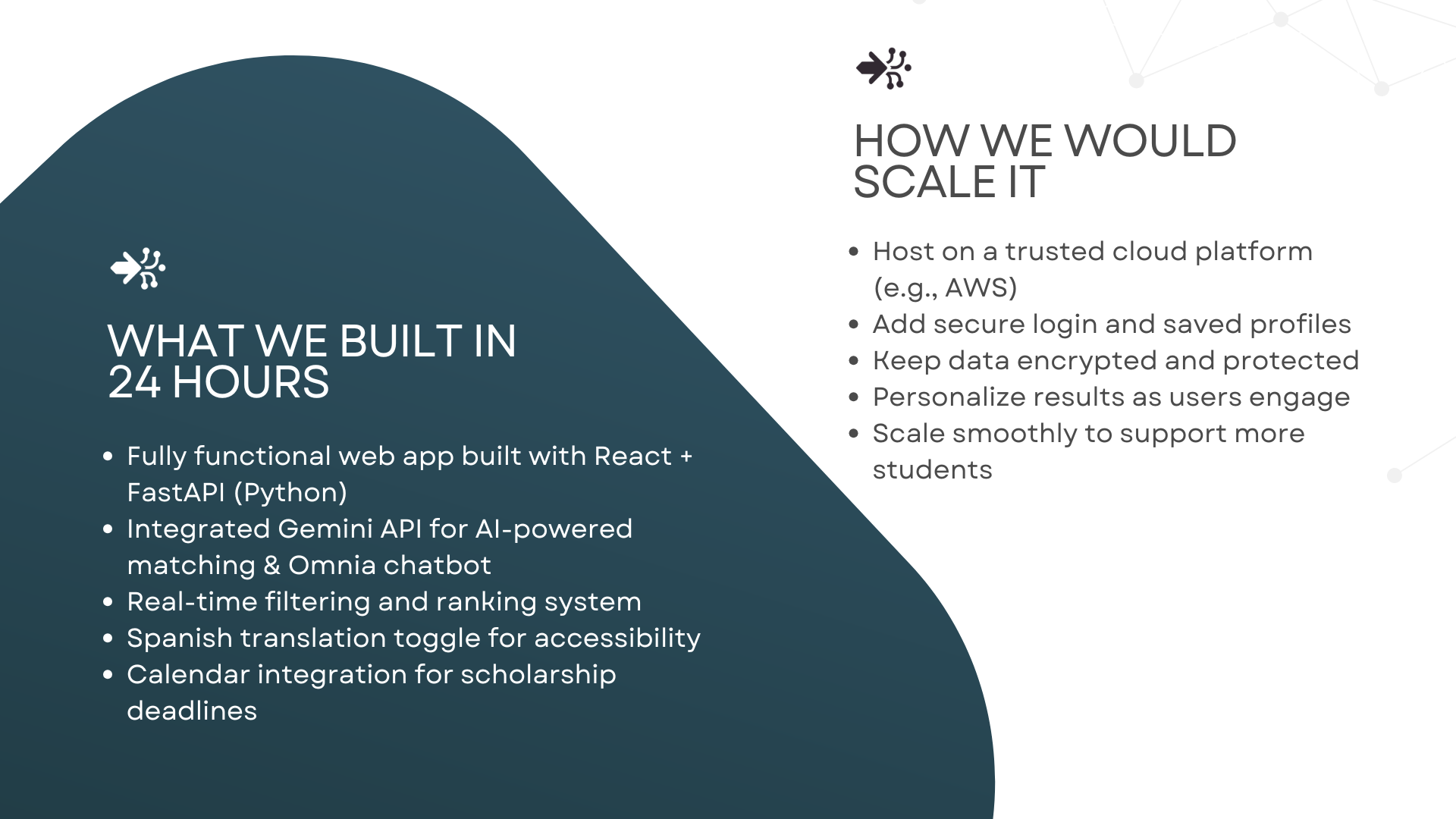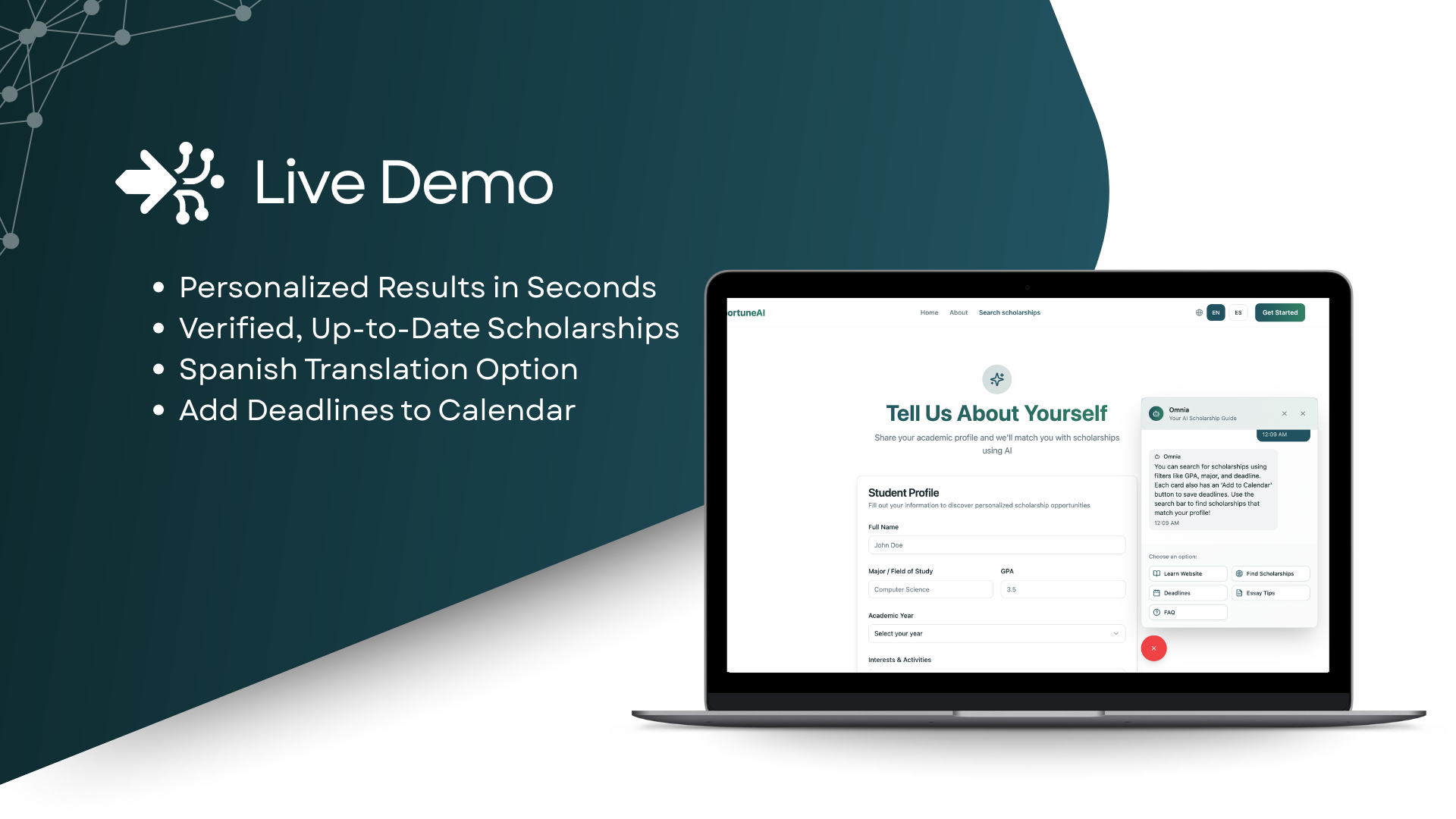 We created a working platform that genuinely makes scholarship searching simpler and more effective. We’re proud of how we blended empathy with technical design, delivering a tool that students can trust to guide them toward opportunities that fit their unique backgrounds.