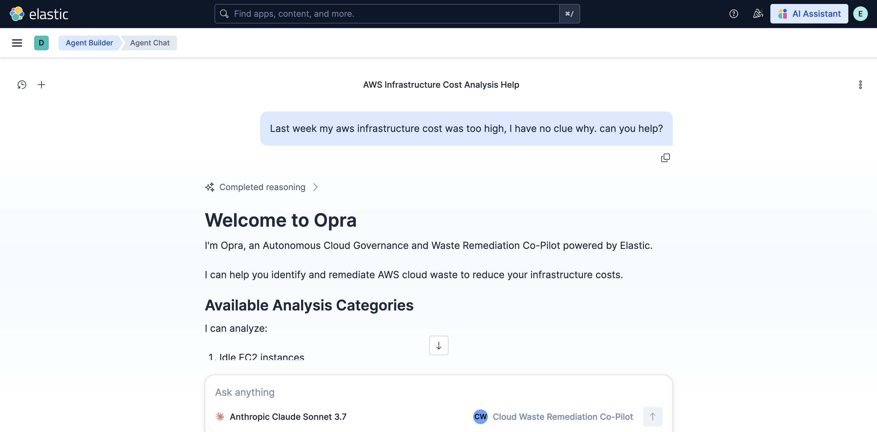 Opra is a multi-step AI agent built with Elastic Agent Builder that: