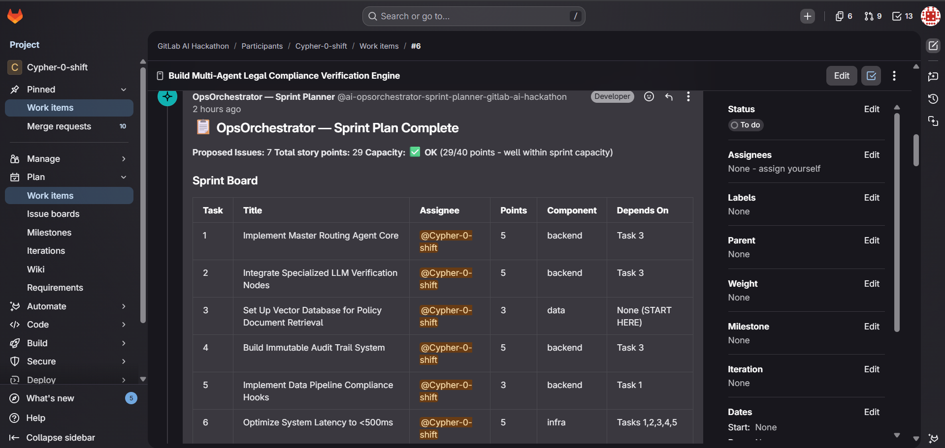 | Sprint Planner | Decomposes vague feature ideas into structured, sprint-ready child issues with Fibonacci estimates, skill-based assignments, and a tracking MR. |