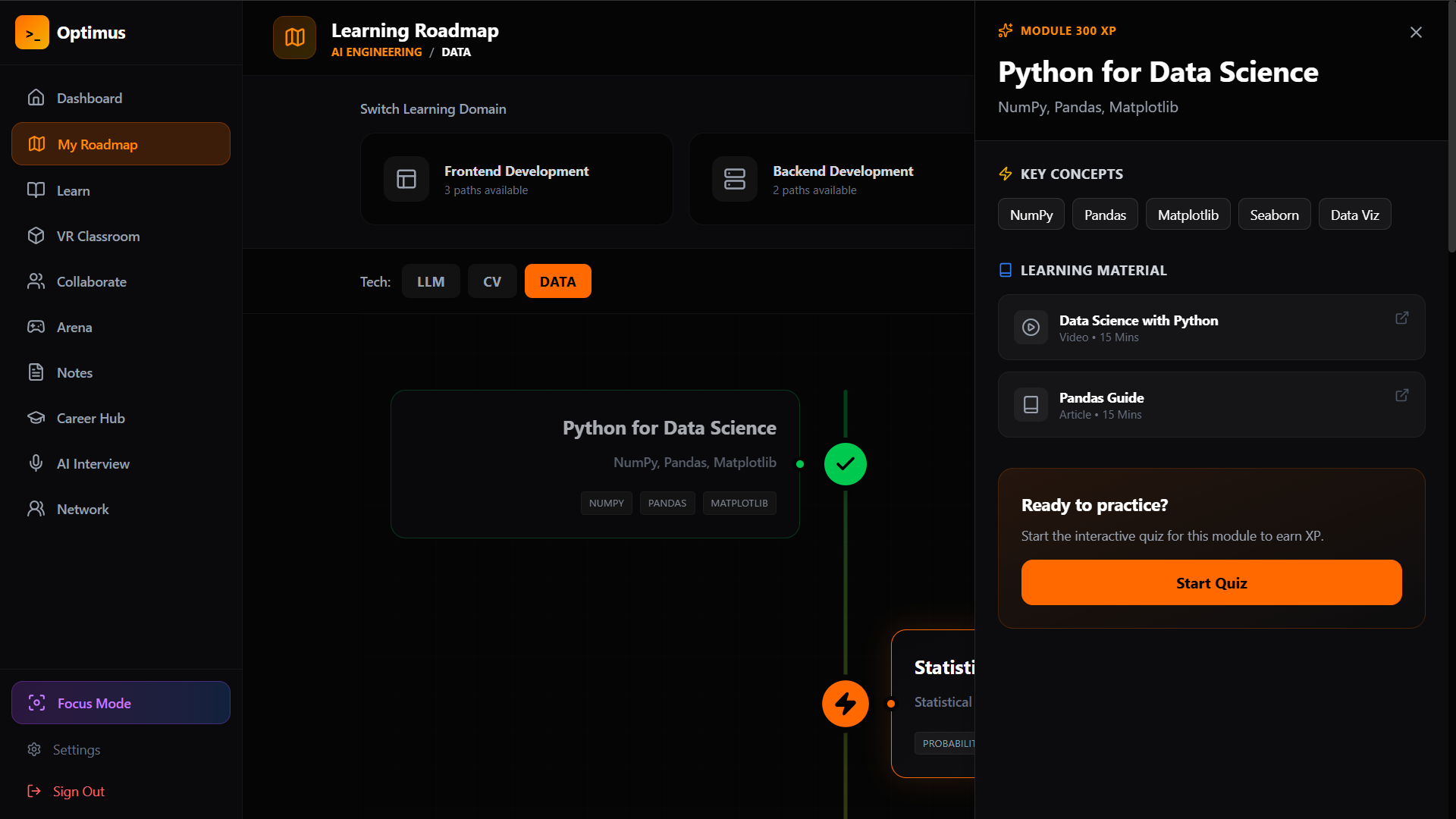 Traditional e-learning platforms follow a one-size-fits-all approach, ignoring individual learning pace, motivation, and skill gaps. Many students struggle due to lack of personalized guidance, real-time collaboration, and accountability in self-paced environments. We envisioned Optimus as more than just a learning platform — an intelligent AI ecosystem that adapts to each learner, guides like a personal mentor, and connects users through collaborative learning.