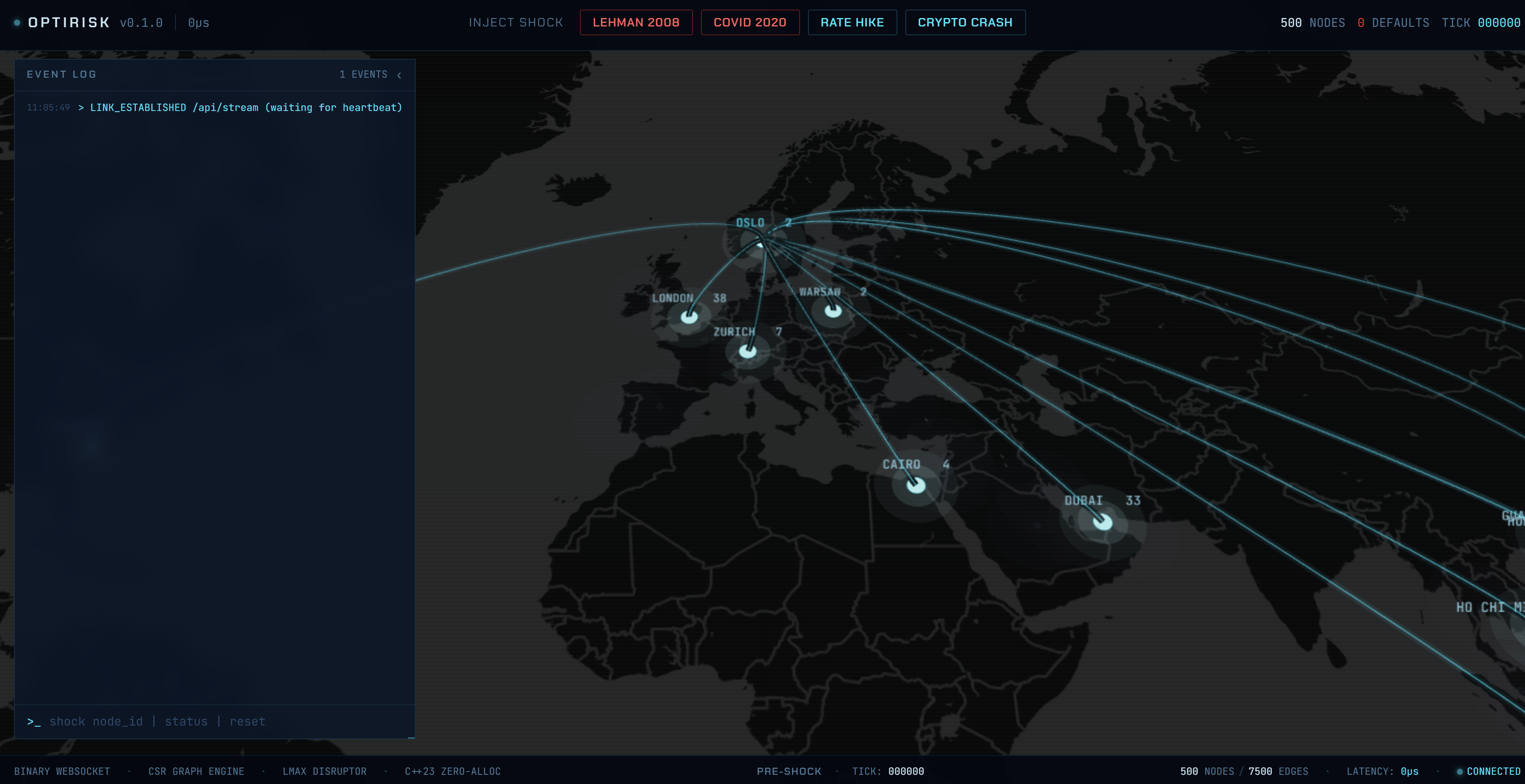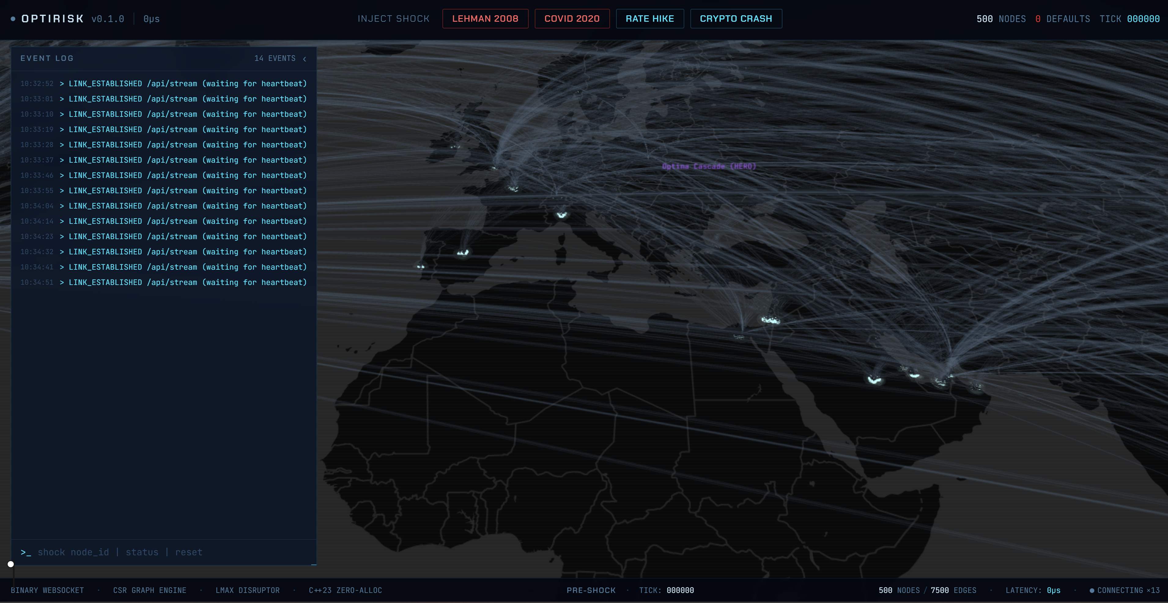 The core contagion engine runs in C++23 and owns the simulation physics. It models the network in pre-shock mode and then transitions into simulation mode once a user-triggered event starts the cascade. The engine is designed around low-latency systems principles, with strict hot-path constraints, lock-free communication, and binary data structures.