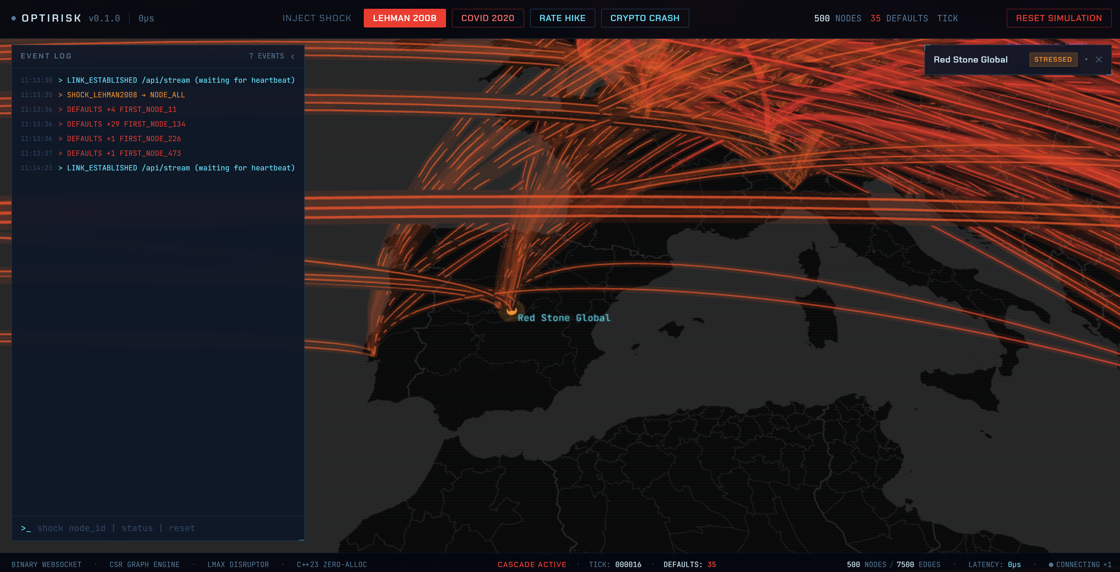 The backend updates node and edge state at high tick intervals as margin stress, defaults, and spillover propagate across the graph. The frontend does not compute the simulation itself. It receives frequent binary updates and renders the evolving contagion state.