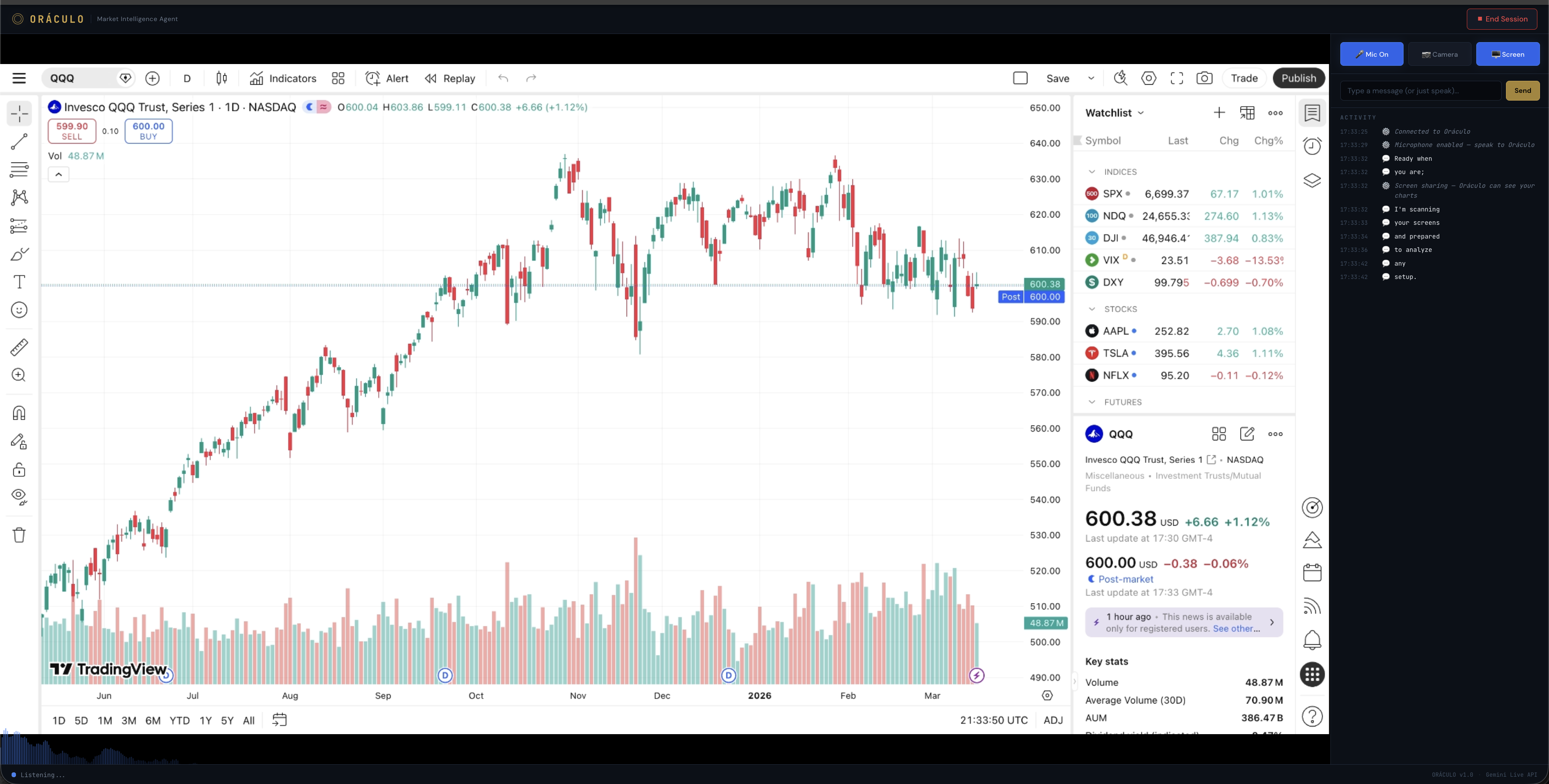 Every hedge fund has a team of analysts watching screens and calling out insights in real-time. They see a pattern forming, check the technicals, glance at the options flow, and tell the trader exactly what's happening. Retail traders? They get a text box.