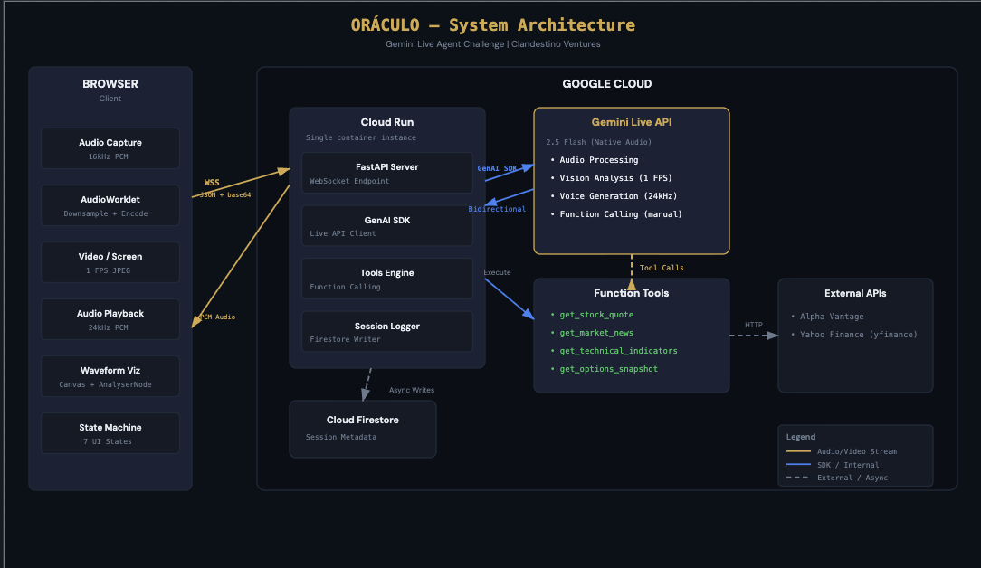 Frontend: Vanilla JavaScript with Web Audio API. An AudioWorklet captures mic input at 16kHz PCM. Gapless audio playback at 24kHz. Screen/camera frames captured at 1 FPS via canvas extraction. Real-time waveform visualization using AnalyserNode — blue when the user speaks, gold when Oráculo responds.