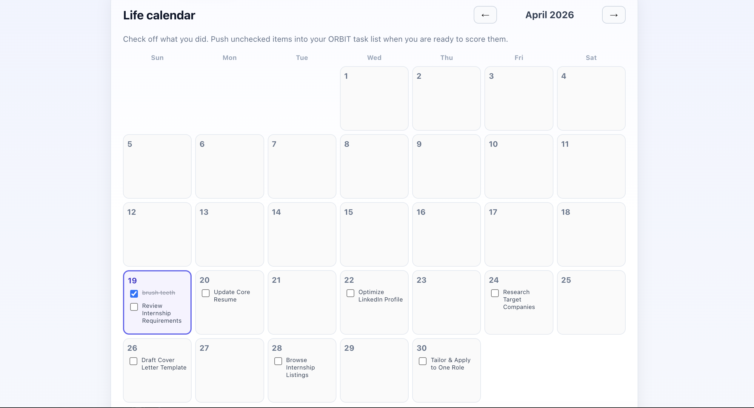 Life calendar — check off wins, then push unchecked steps into Orbit for scoring and scheduling.