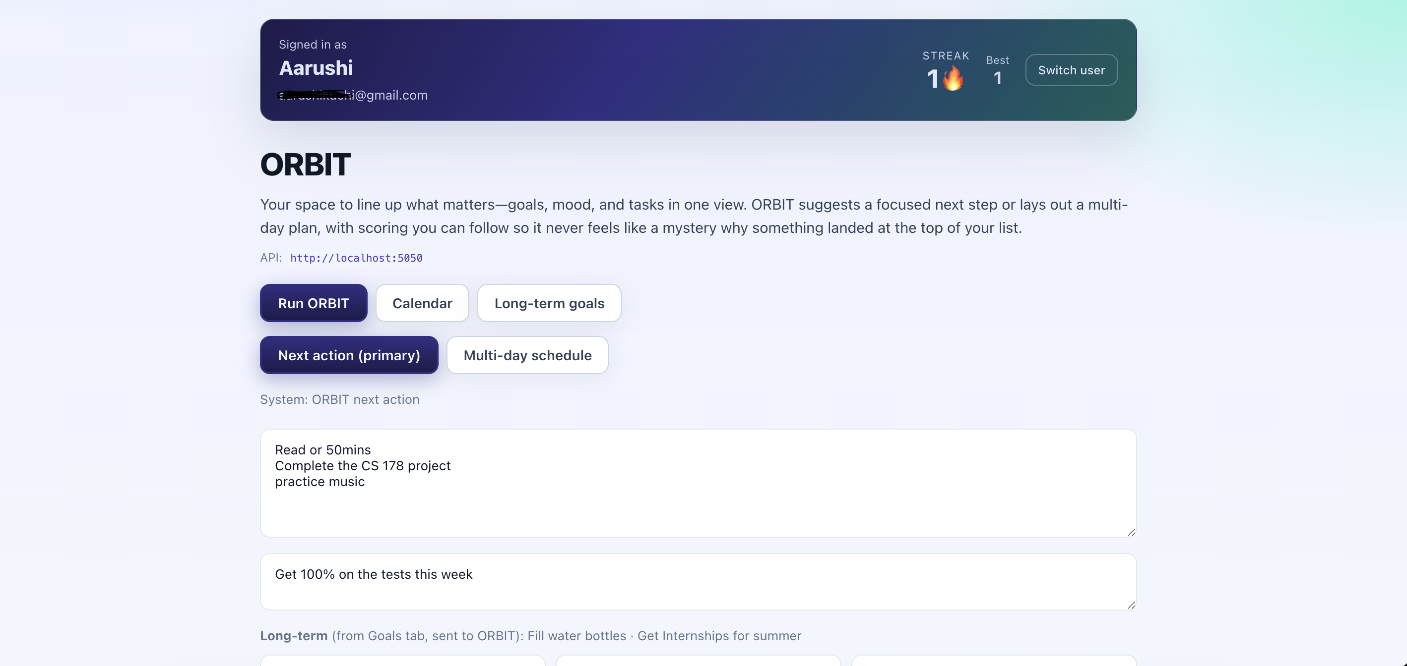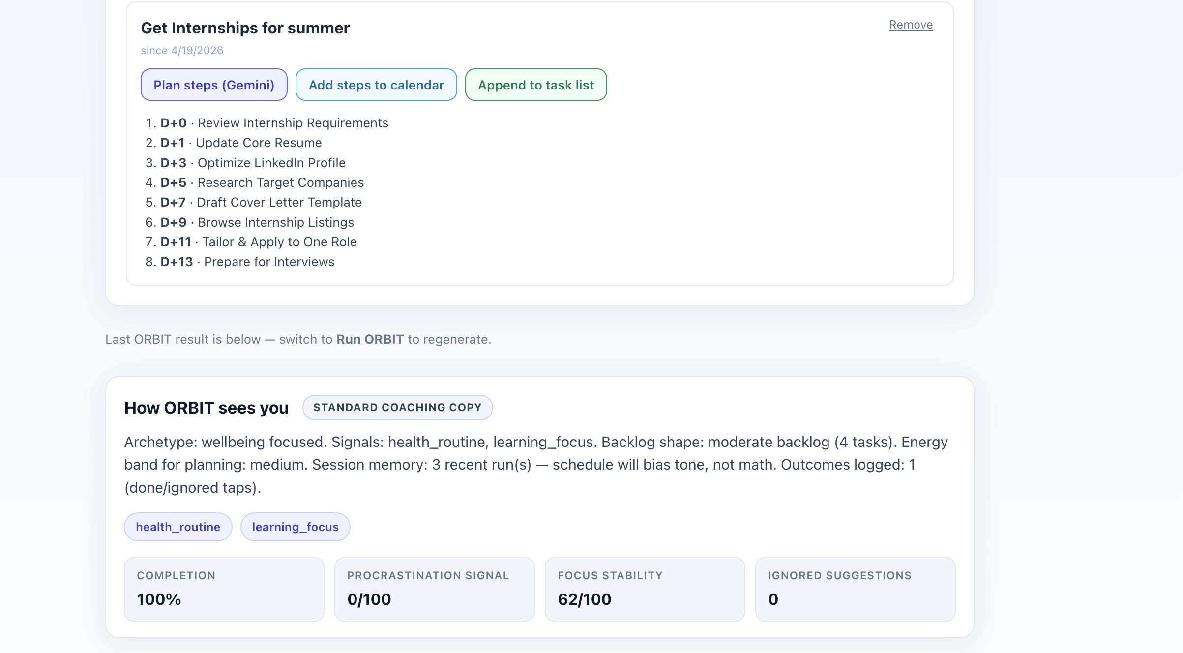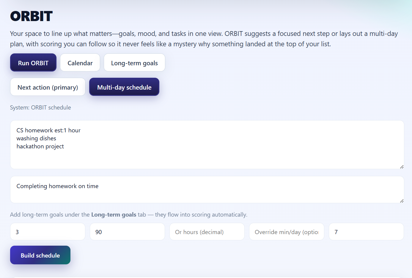 Orbit takes tasks, mood, time available, and goals, then returns: