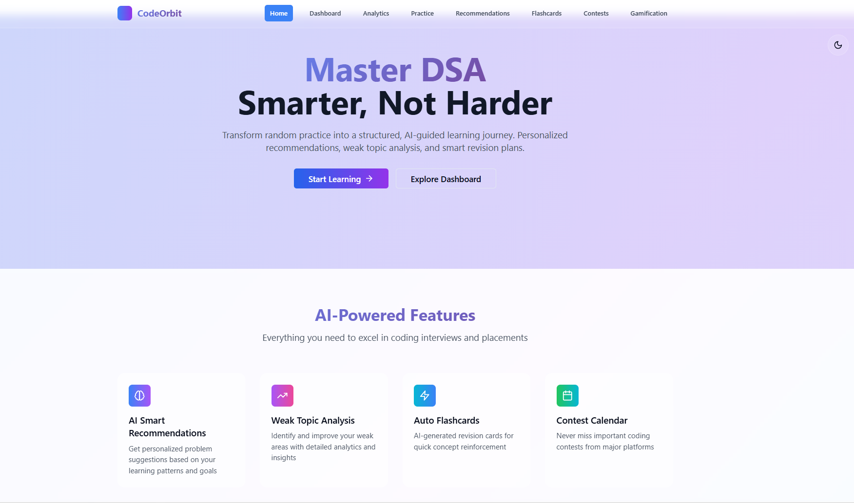 CodeOrbit is an AI-powered platform that provides personalized DSA learning. It analyzes user performance, identifies weak topics, and recommends the next best problems, along with revision tools and progress tracking.