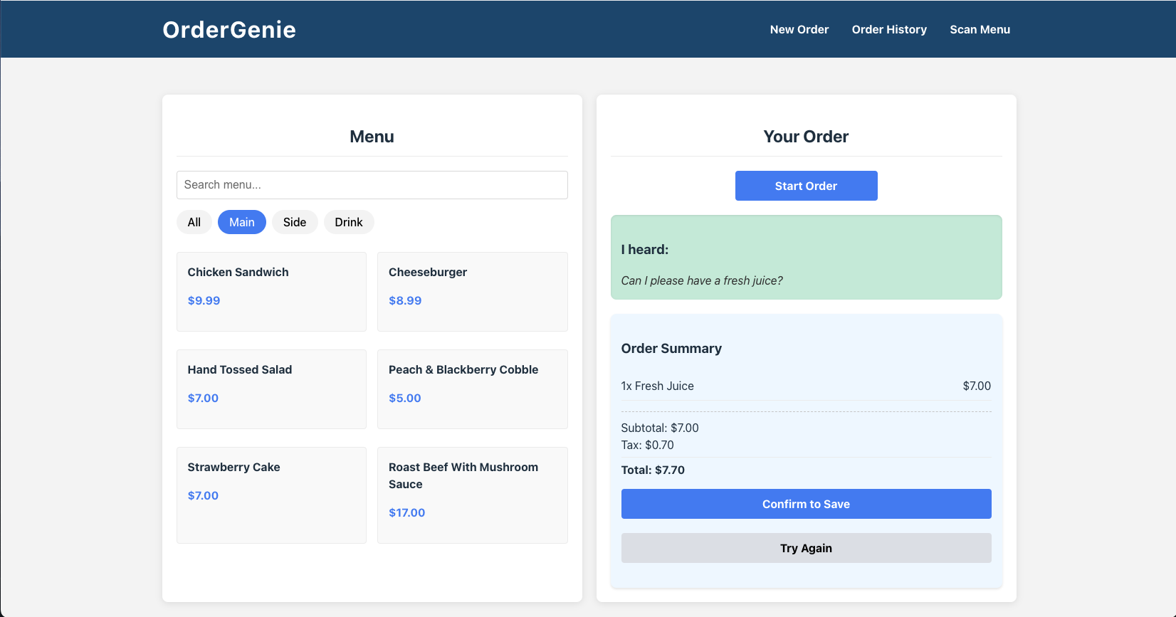 As a frequent diner, I noticed restaurant staff juggling handwritten orders, often leading to errors and delays. The vision for OrderGenie emerged from a simple question: What if servers could just speak orders into a device that not only captures what they say but truly understands their intent? An application built for servers in a fast-paced restaurant.