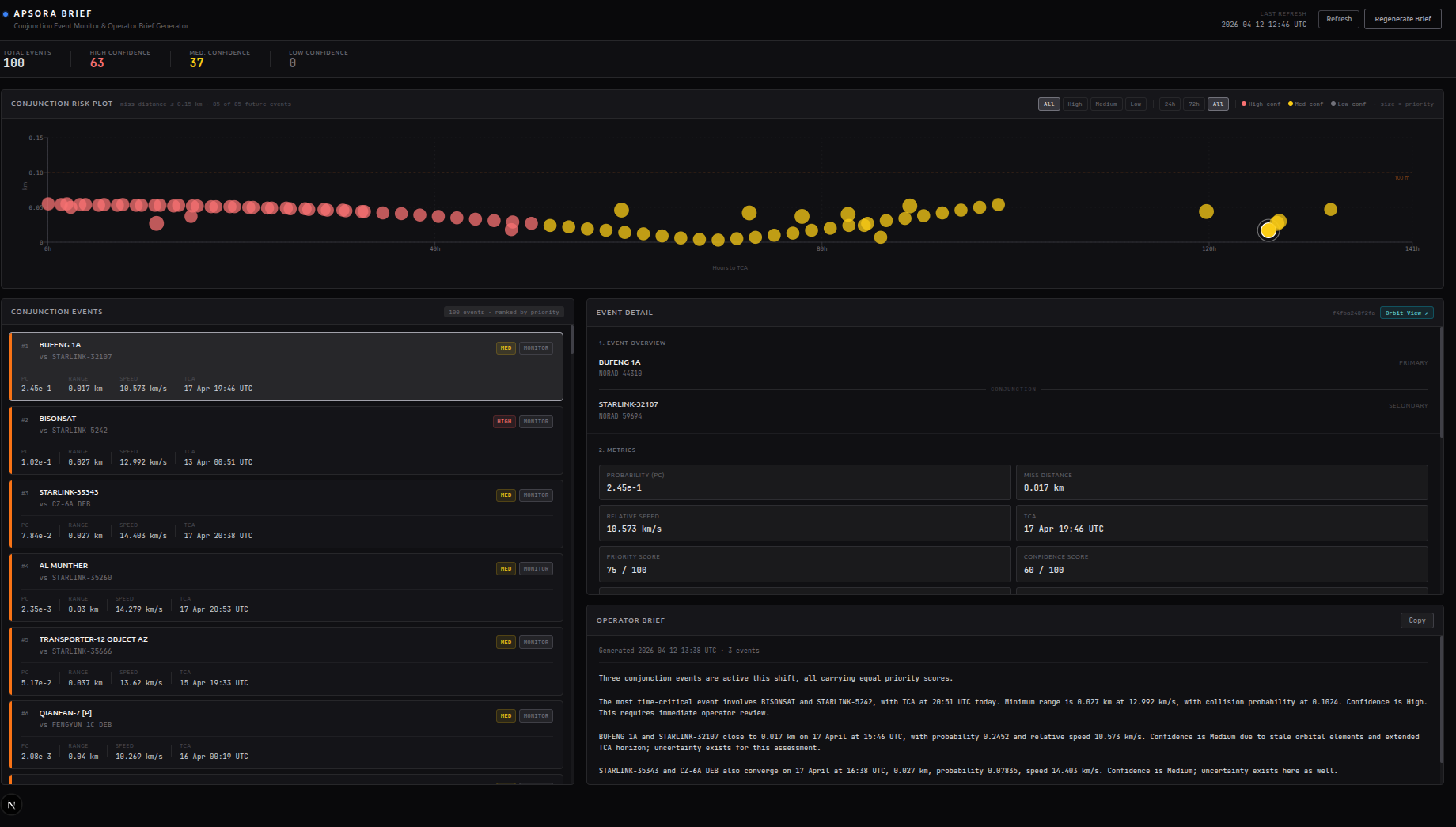Apsora Brief pulls live conjunction screening data from SOCRATES/CelesTrak — the same source used by real space operators — and automatically ranks every close-approach event by risk using miss distance, collision probability, relative speed, and TLE data freshness. It then calls Claude to generate a plain-language situational brief that an operator can read in 30 seconds and act on. Every tracked satellite's orbit is rendered in a real-time 3D Cesium globe with confidence-colored trajectory lines, and a TCA playback scrubber lets you step through the exact geometry of closest approach, minute by minute.