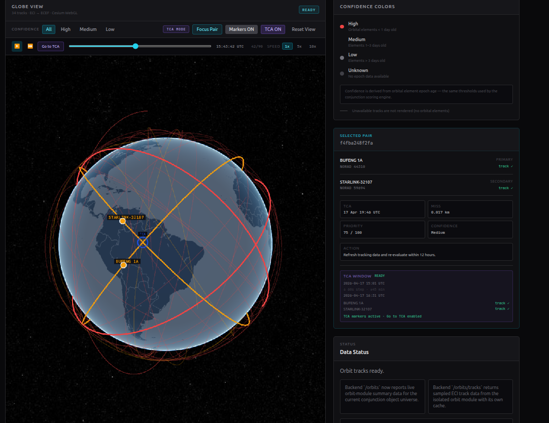 Getting SGP4 orbital propagation to produce visually correct results on a 3D globe was the hardest technical problem — ECI (Earth-Centered Inertial) coordinates from the propagator have to be rotated into ECEF (Earth-Centered Earth-Fixed) using Greenwich Mean Sidereal Time, and any error in that math puts satellites in the wrong hemisphere. We also had to solve a subtle time-window mismatch: the general orbit tracks cover the next 90 minutes from now, but the Time of Closest Approach for a given event might be days away — so pair markers and TCA rings were floating in space with no matching trajectory visible until we added TCA-centered pair track windows. Making the Cesium globe fill its container correctly also required diagnosing a missing CSS import that left the canvas sized at initialization and never resized, even as the flex layout resolved around it.