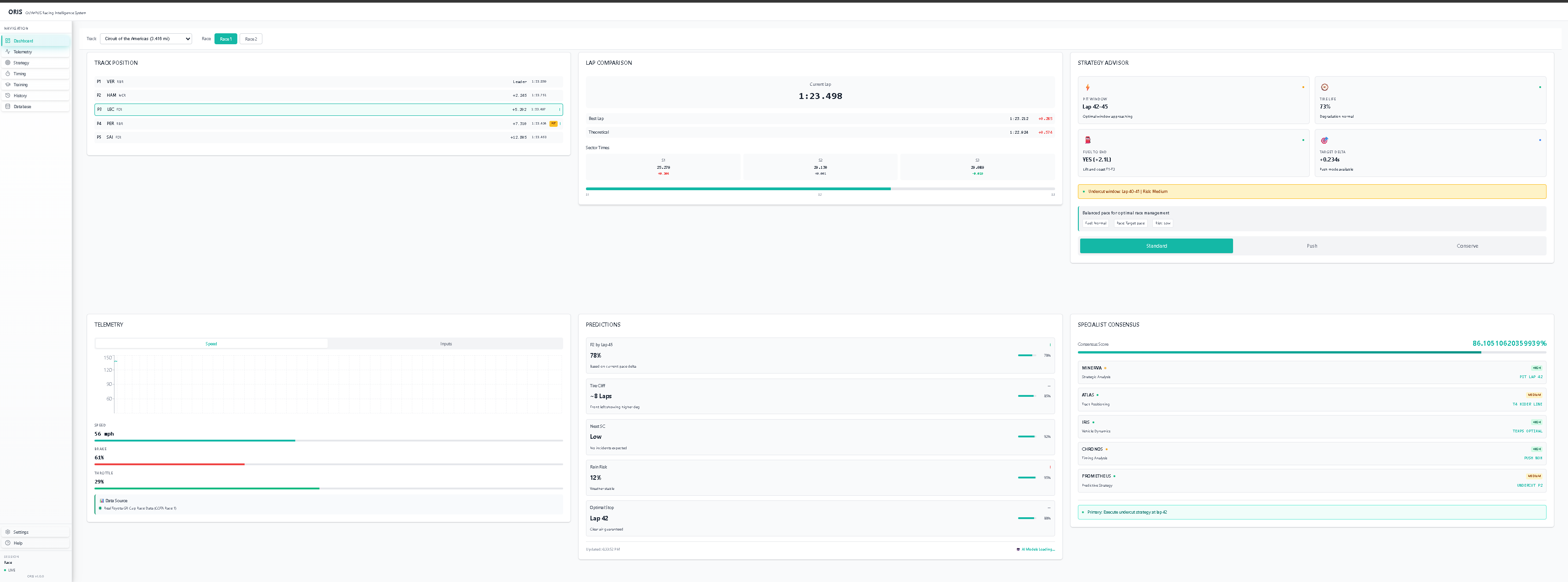 ORIS (OLYMPUS Racing Intelligence System) is a real-time AI race engineer that transforms raw telemetry into strategic racing insights. The system features five specialized neural networks: