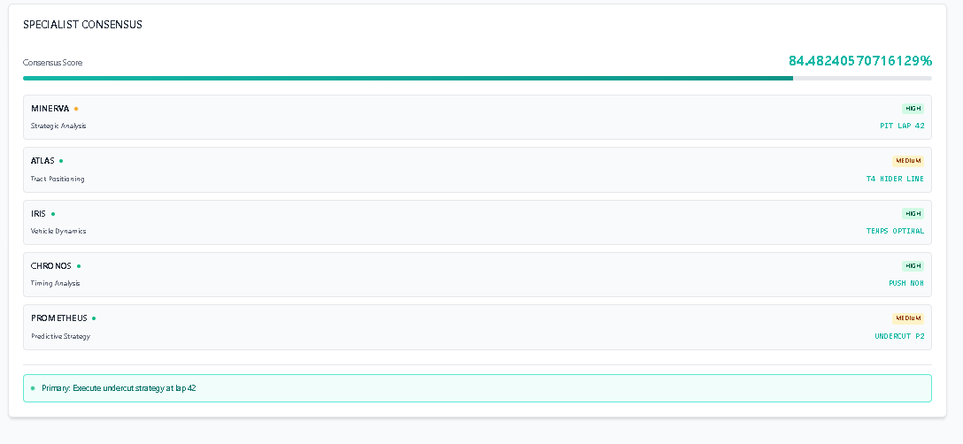 - MINERVA analyzes race strategy - when to pit, how aggressive to be, traffic management