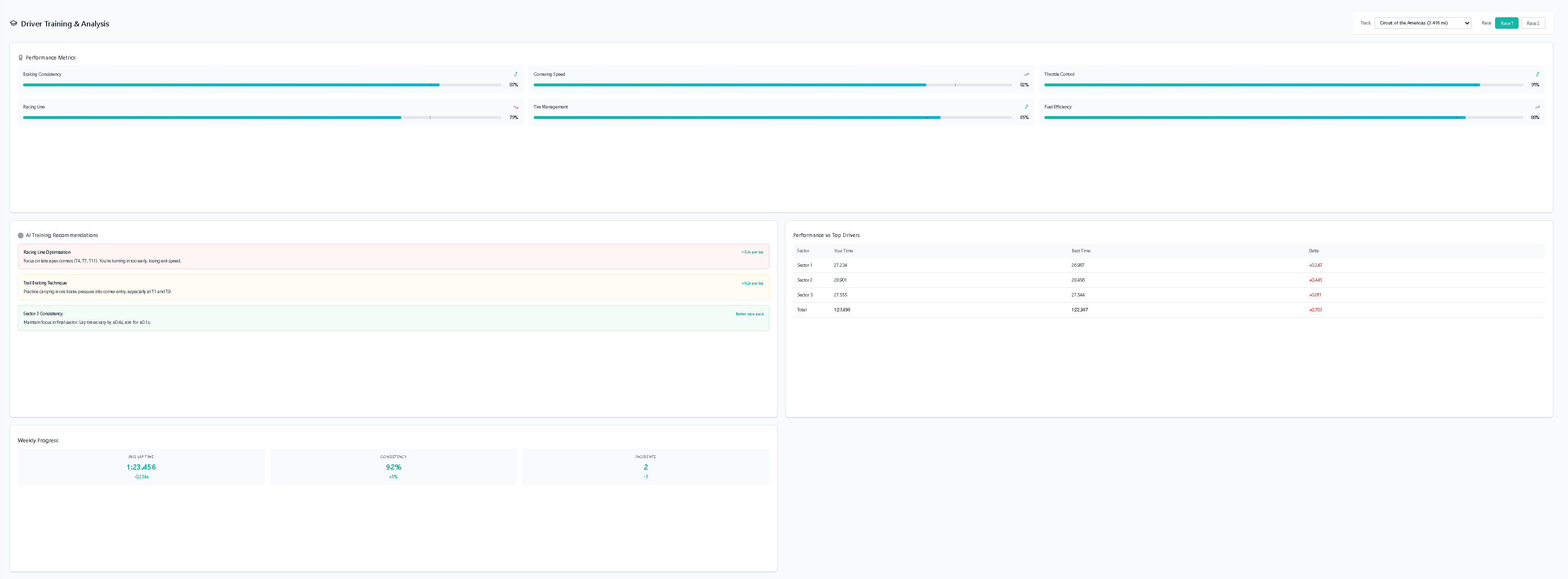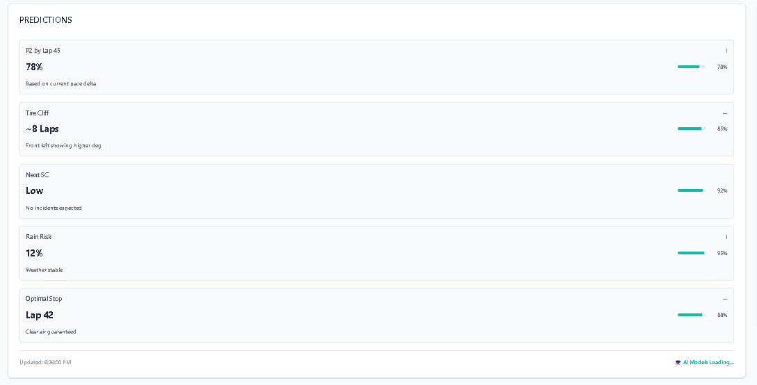 Model Complexity: Designing neural networks that could handle the sequential nature of racing telemetry while providing interpretable strategic insights was incredibly complex. I went through multiple architectures before settling on attention-based models with specialized prediction heads.