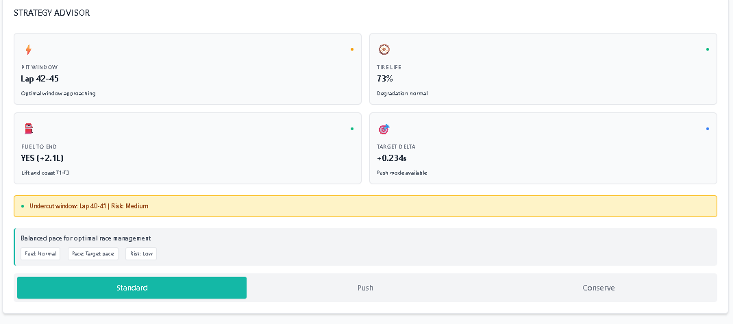 The system processes live Toyota GR Cup telemetry at 60Hz and delivers recommendations through an intuitive dashboard that race engineers can use during actual races.