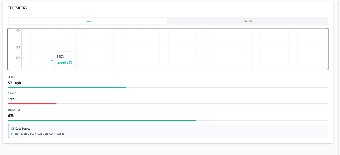 Data Pipeline: I processed the official Toyota GR Cup datasets from 6 tracks (COTA, Road America, Sebring, VIR, Barber, Sonoma), handling the exact telemetry parameters specified in the hackathon: speed, throttle position, brake pressures, steering angle, and accelerations.