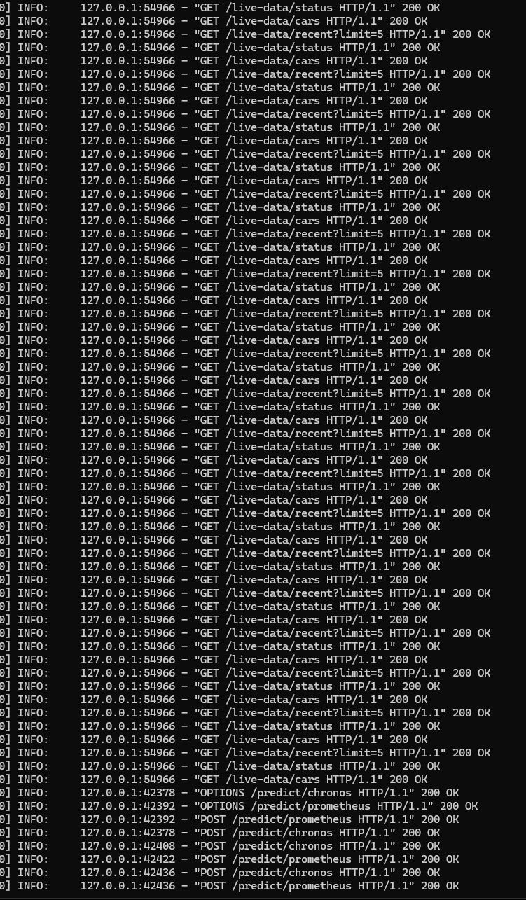 Backend: FastAPI serves the AI models with real-time inference capabilities, live data endpoints for field car connections, and comprehensive model status monitoring.