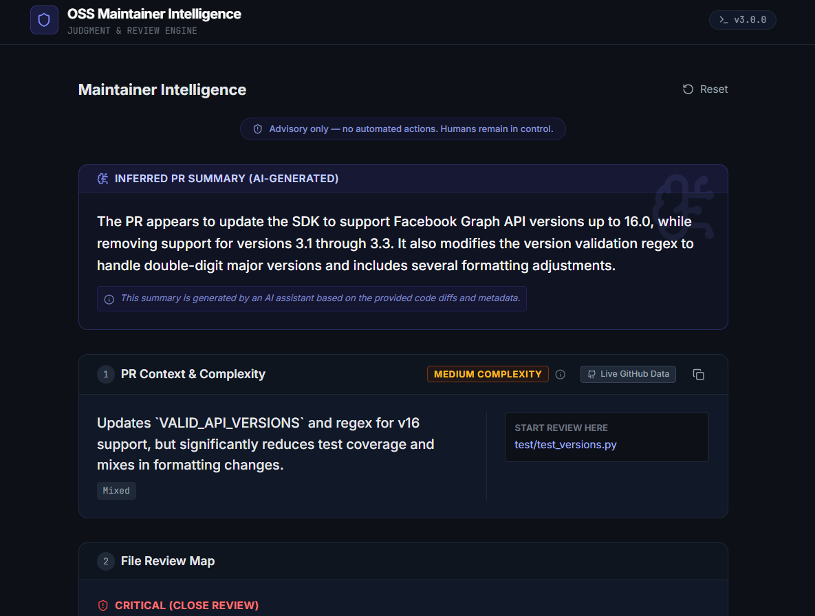 From my own experience reviewing and merging PRs, I realized that the hardest part of open source is reviewing code safely, not writing it. This project was inspired by a simple idea: AI should help humans make better decisions, not just generate more output.