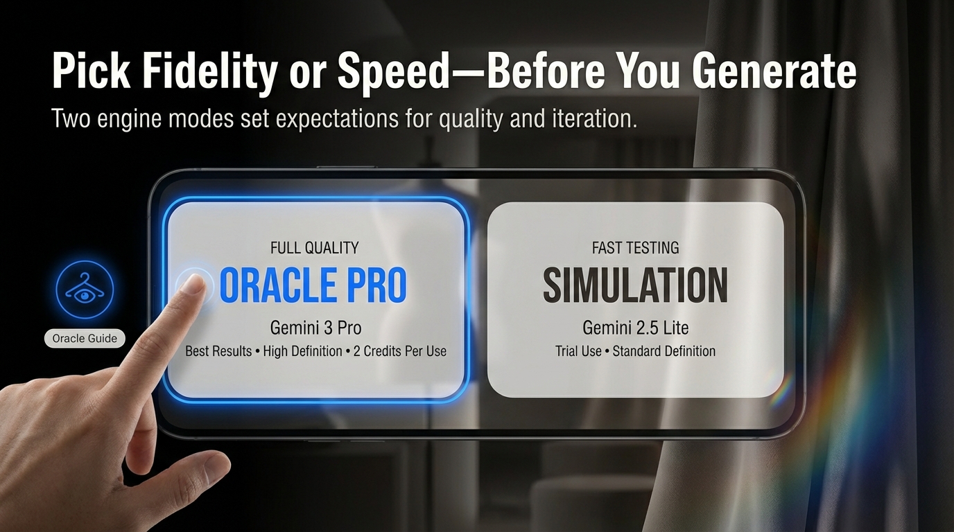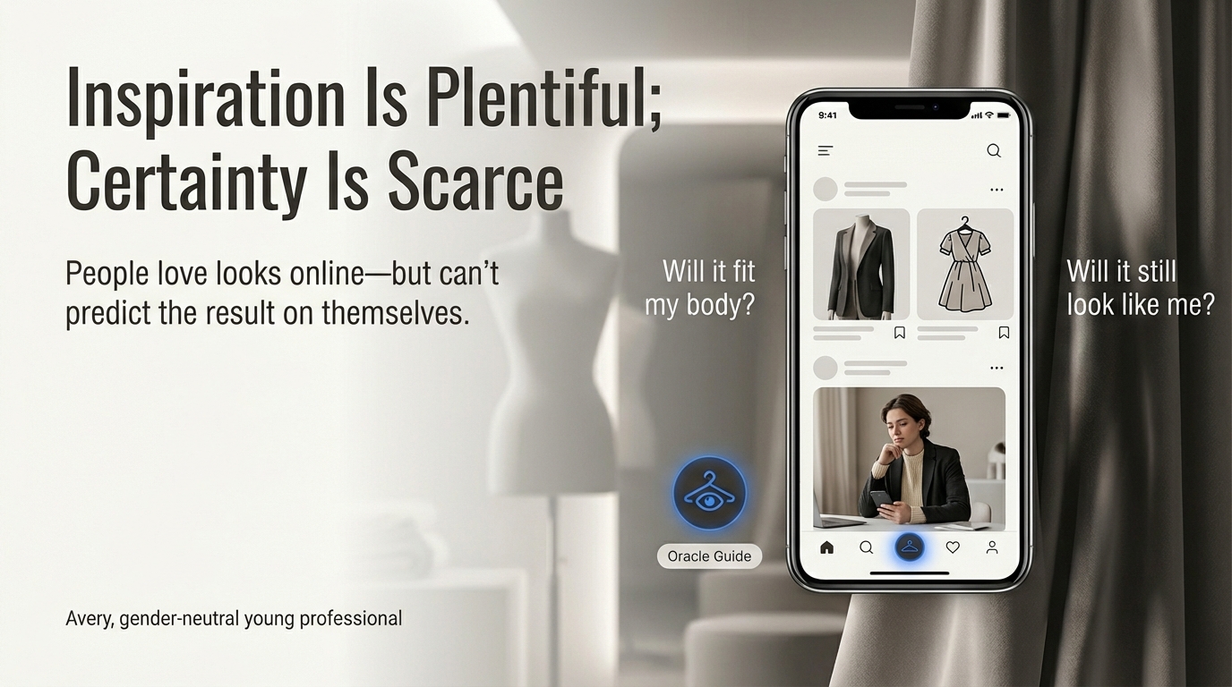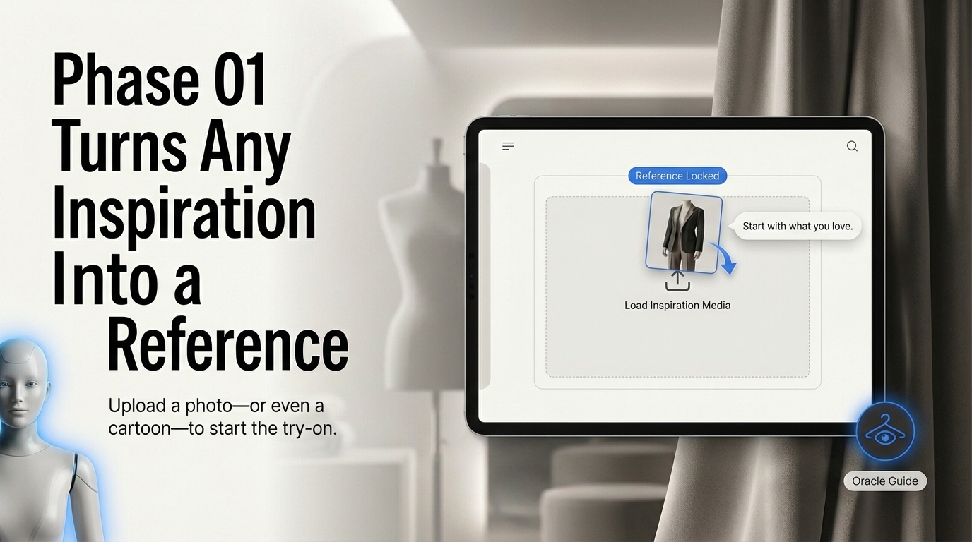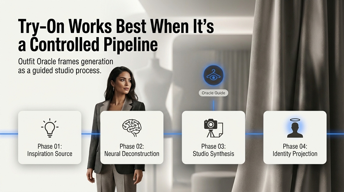 Outfit Oracle™ lets users: Upload a photo of an outfit they love. Scan and identify every garment in the image. Digitally recreate it with realistic folds, textures, and colors. Upload their own photo to try the outfit on themselves. Customize colors and download the result for personal use.
