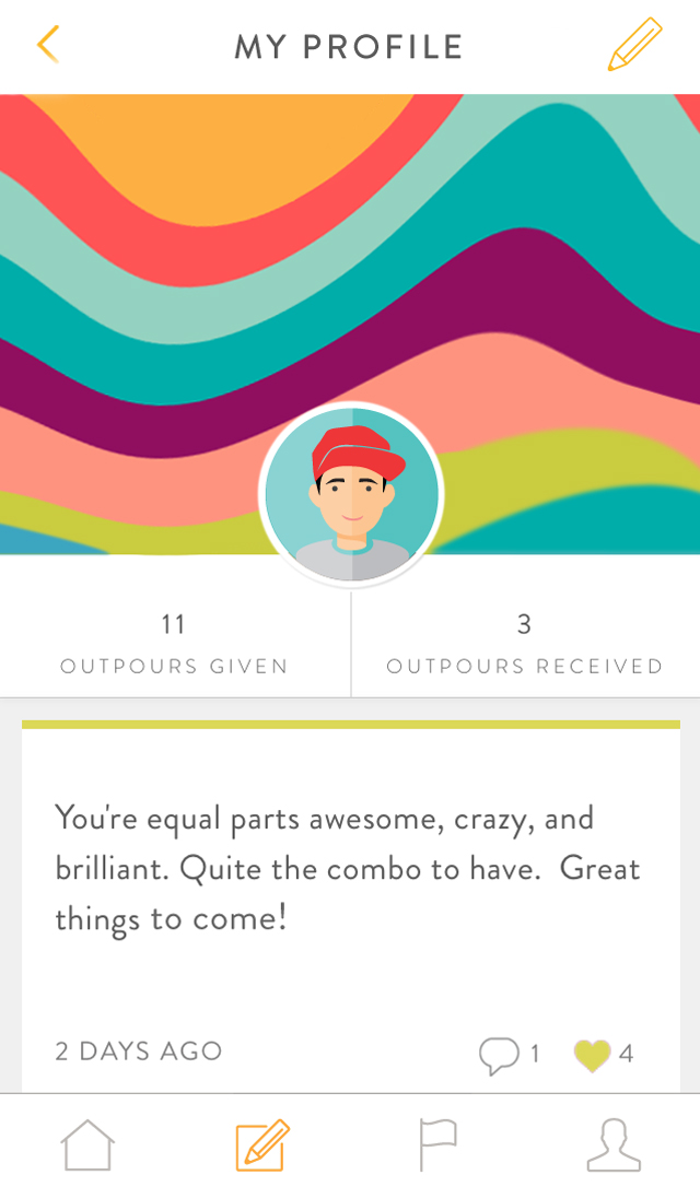 Outpour is a social mobile app that lets you write anonymous appreciative messages for people you care about. On Outpour, it is easy and encouraged for you to tell your best friend that he is amazing, your coworker that she rocks, and your hero that she’s changed your life. We are getting more people to say more good things to each other – because people should know they are loved.