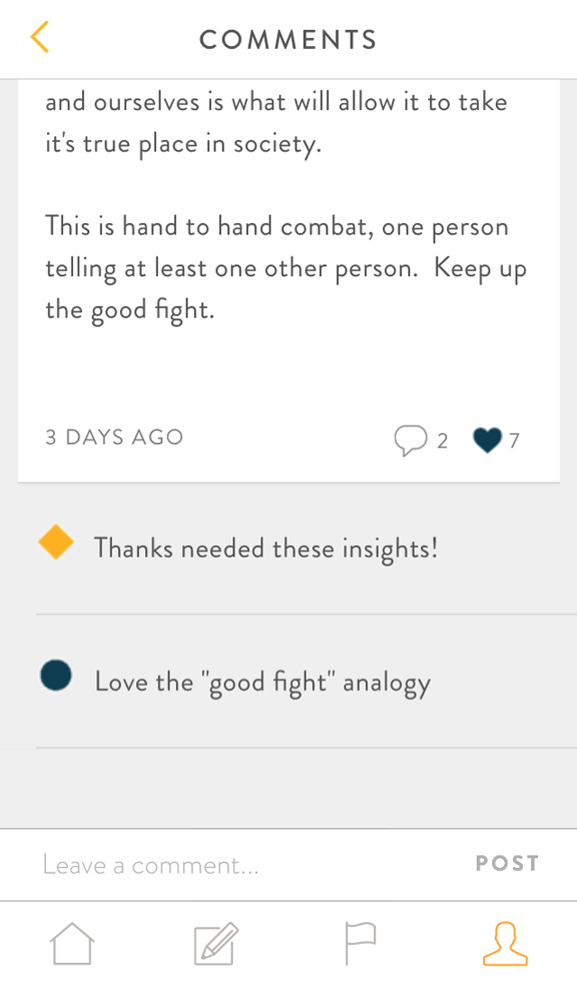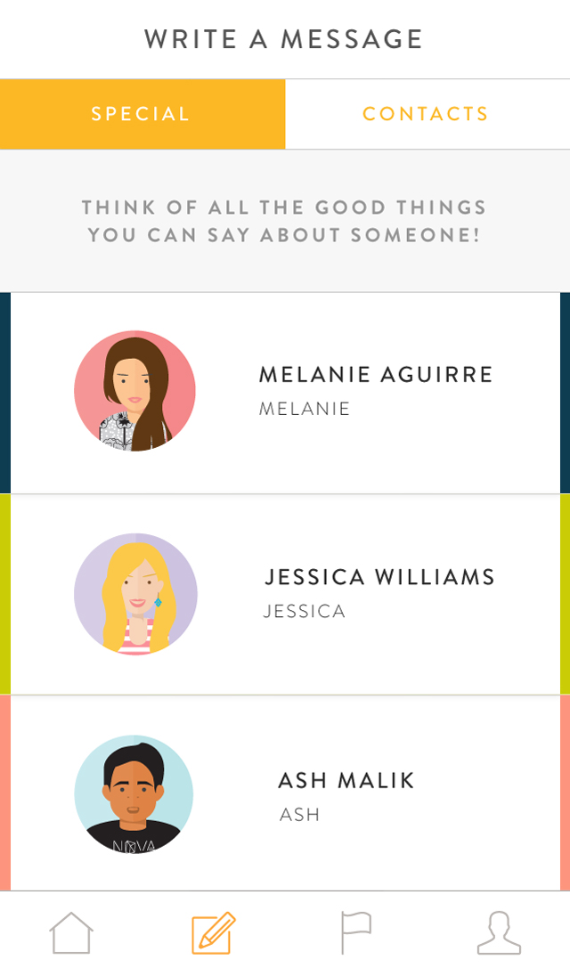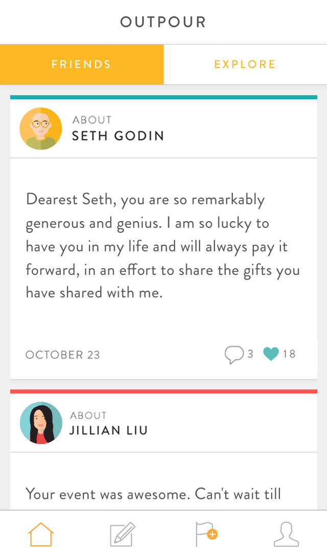 Outpour users do two things: First, write messages of gratitude. They can select people from a list of friends, search by username, or create profiles such as “My Favorite Barista.” Second, they can view messages written by and about their friends, as well as popular messages worldwide.