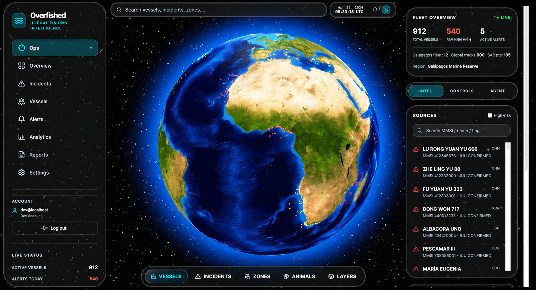 Detection: At the core is an anomaly detection model trained on AIS vessel trajectories. It flags behavioral patterns associated with IUU (Illegal, Unreported, and Unregulated) fishing — including AIS spoofing, dark vessel activity, and prohibited zone incursions.