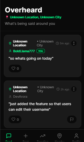 🧠 Problem Statement People constantly overhear funny, strange, or chaotic things in public spaces — but there's no real-time platform to share or discover them by location. "Overheard" turns this social phenomenon into a real-time, geo-tagged stream of quotes.