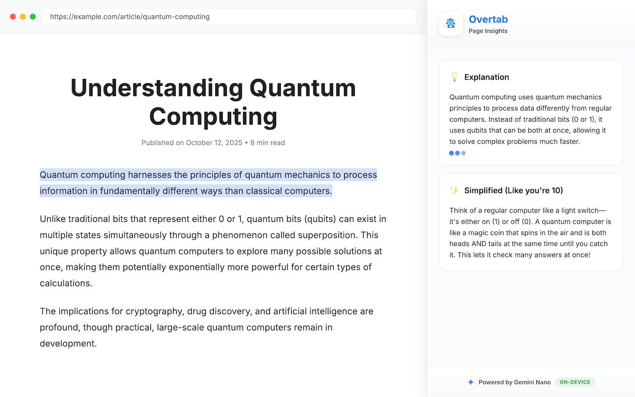 Overtab is your privacy-first AI browsing companion that makes understanding the web effortless: