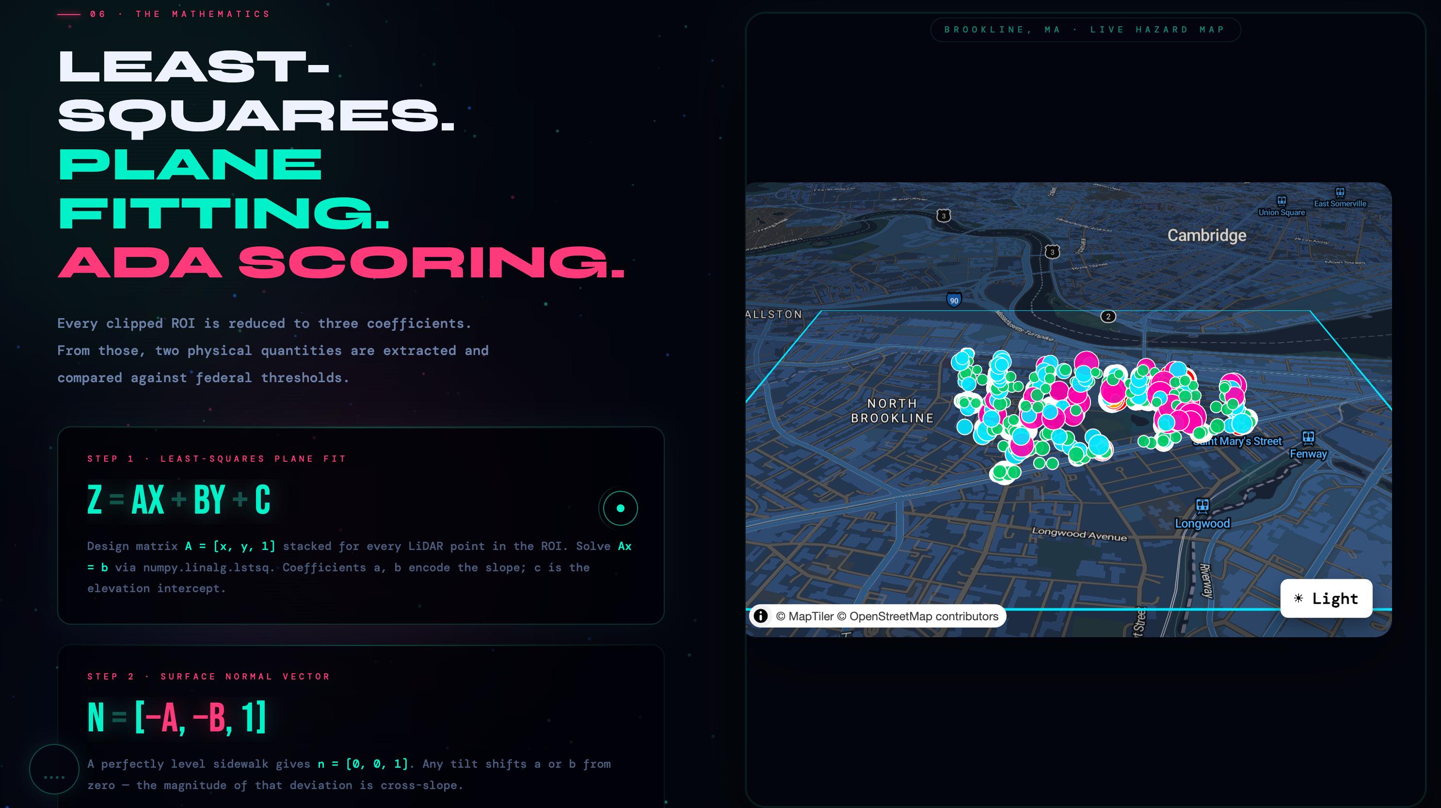 Automated ADA sidewalk compliance detection using mobile LiDAR point clouds, plane-fitting mathematics, and real-time web visualization.