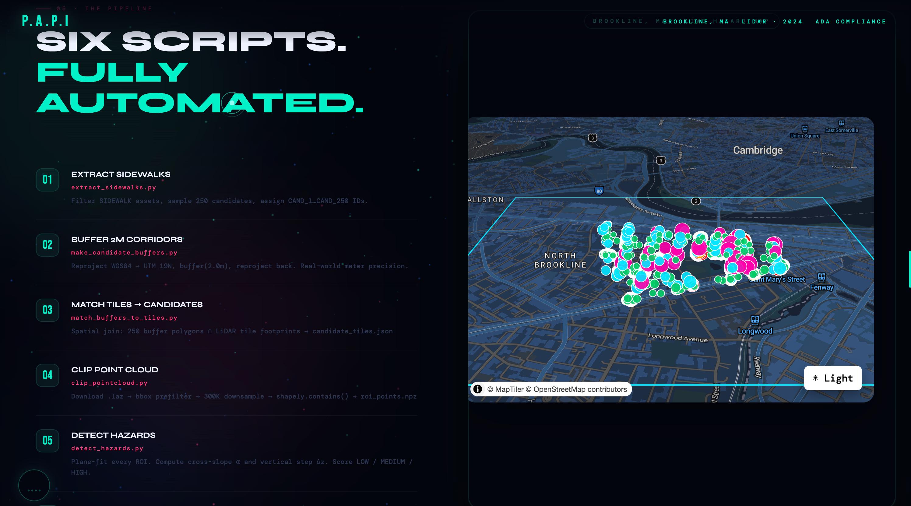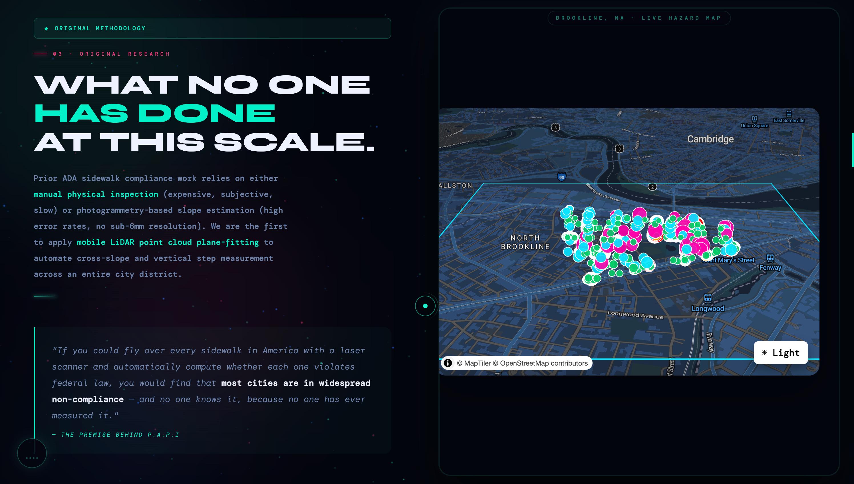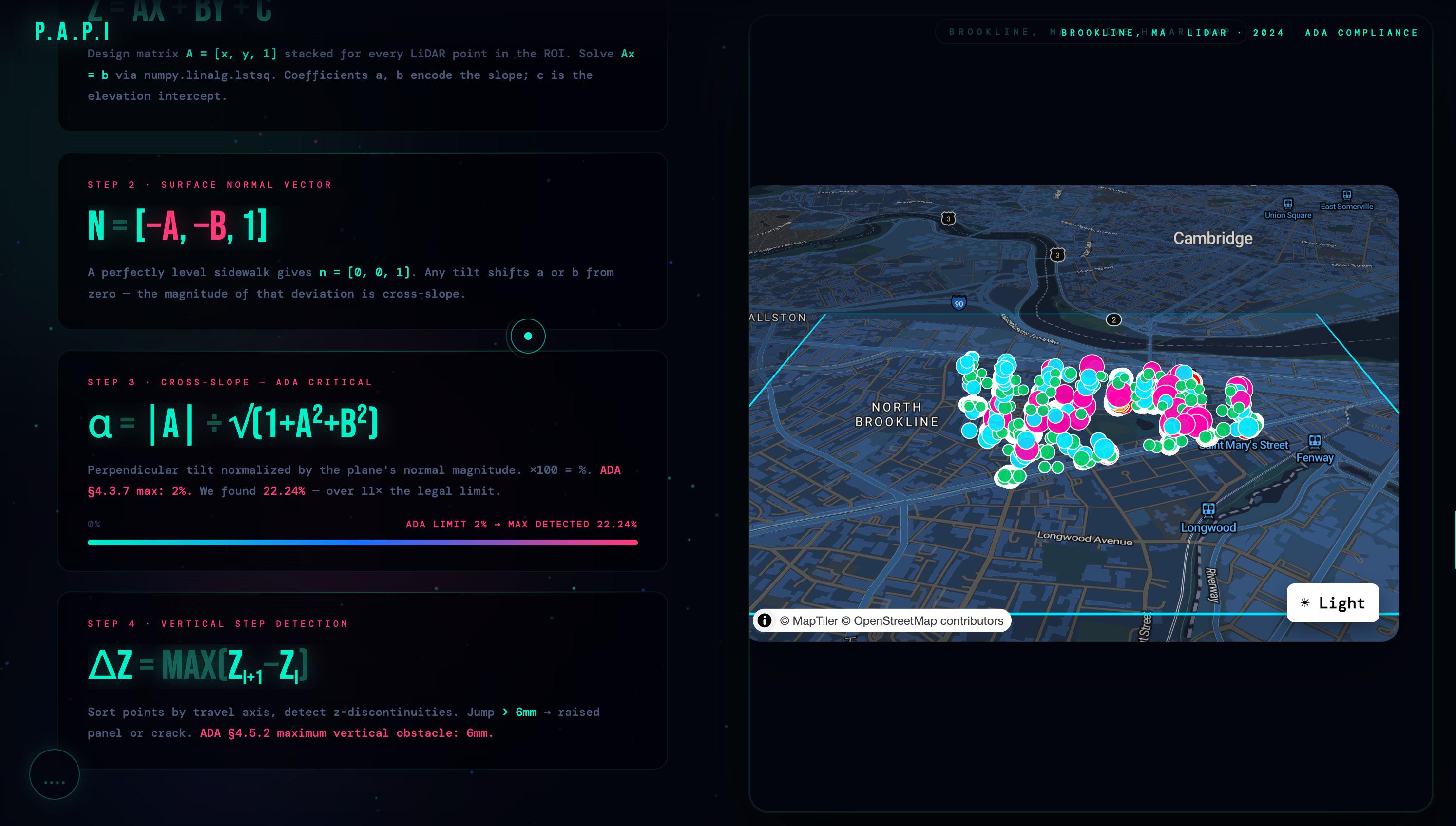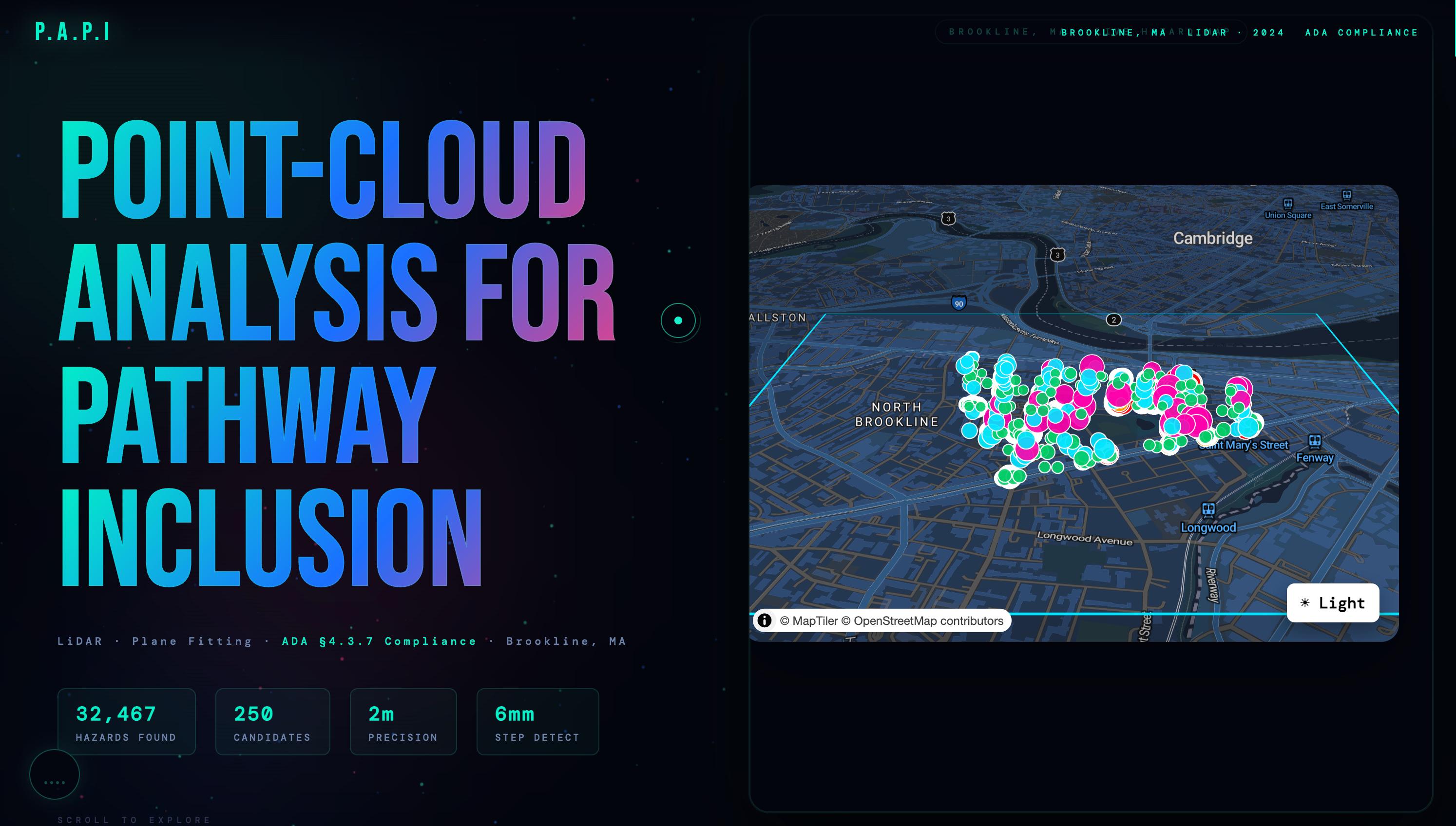 **P.A.P.I** · Point-cloud Analysis for Pathway Inclusion Brookline, MA · 2024 Built with LiDAR, mathematics, and the belief that public space should be accessible to everyone. *The data has always been there. We just finally did the math.*