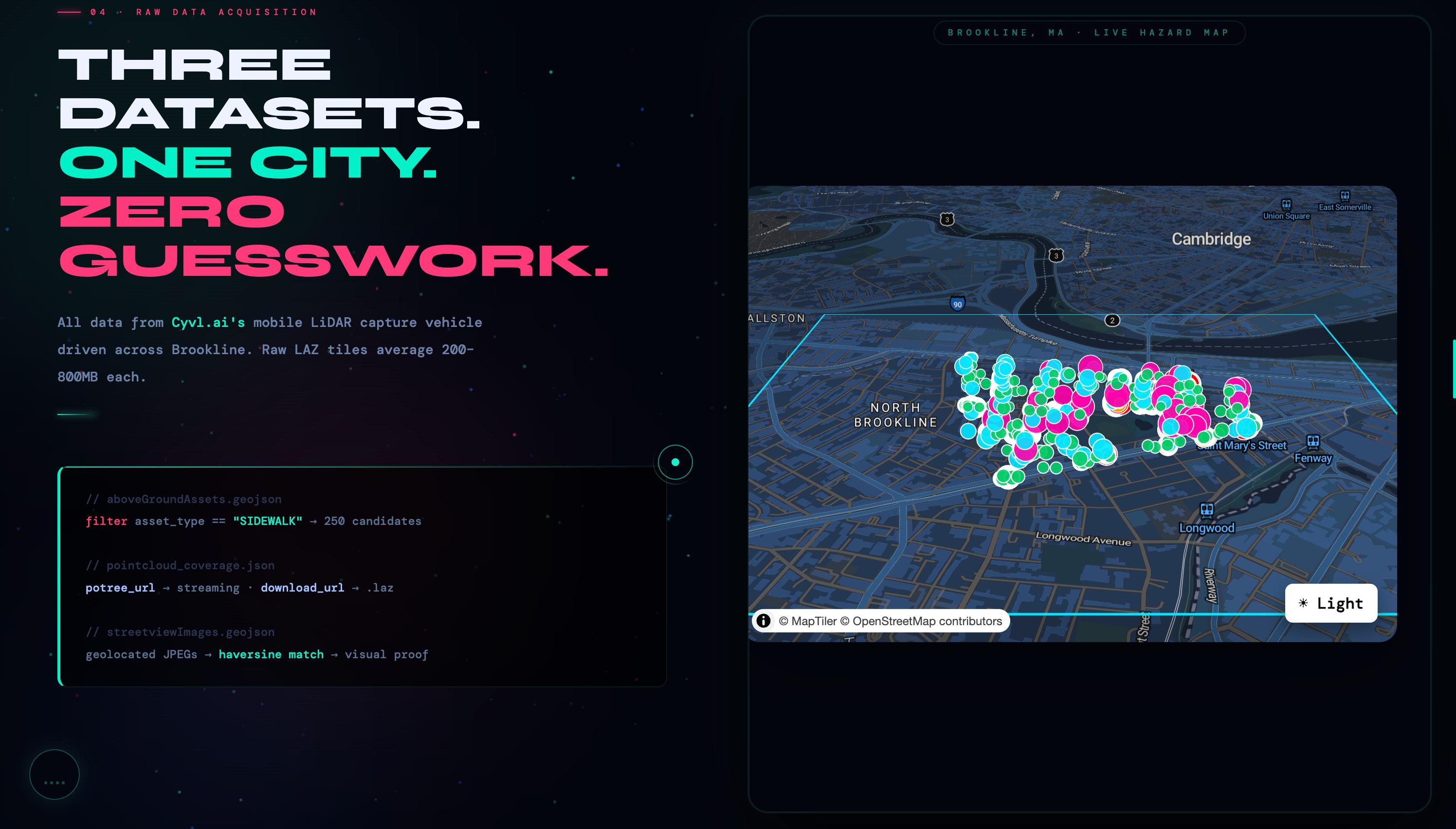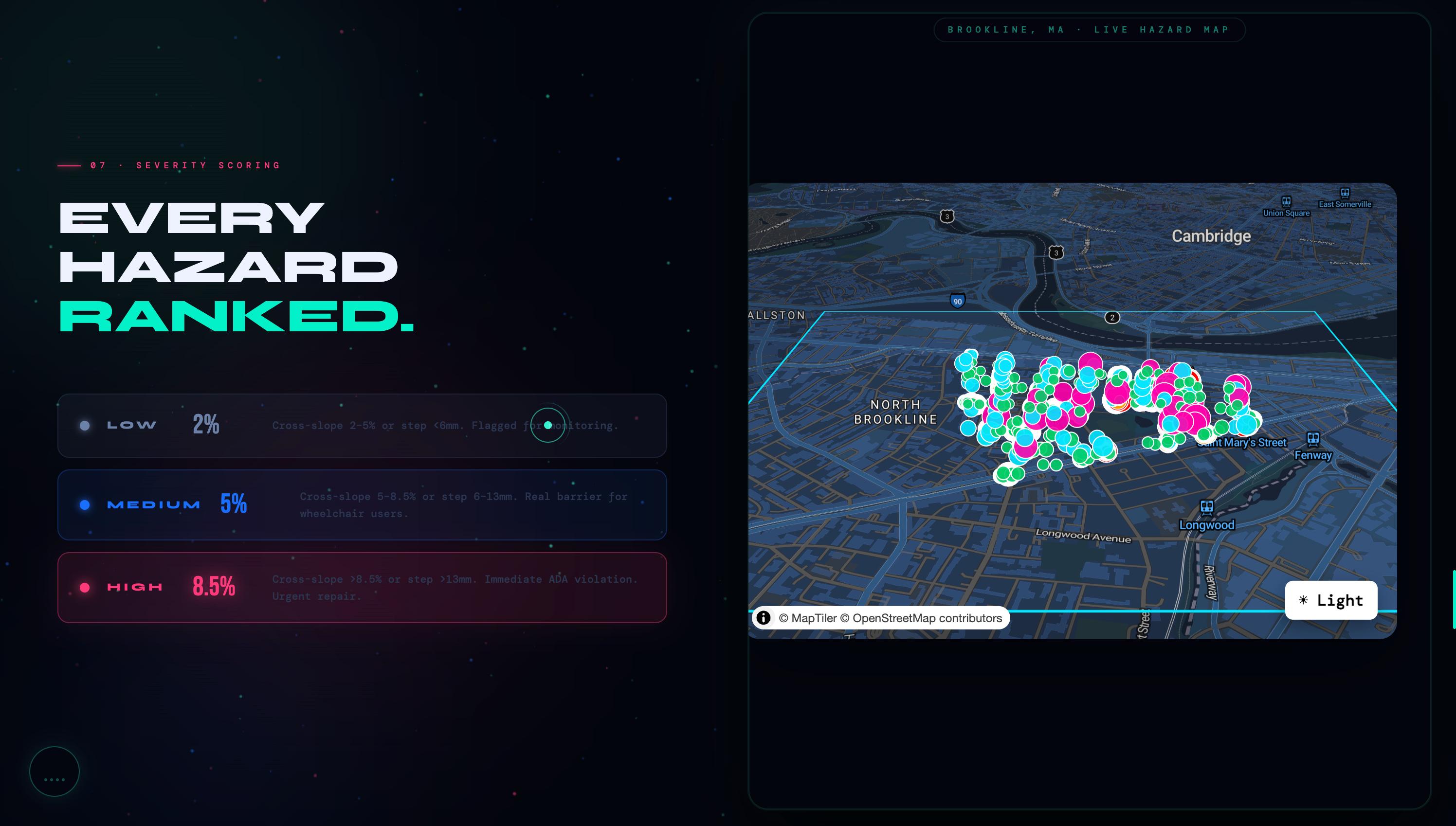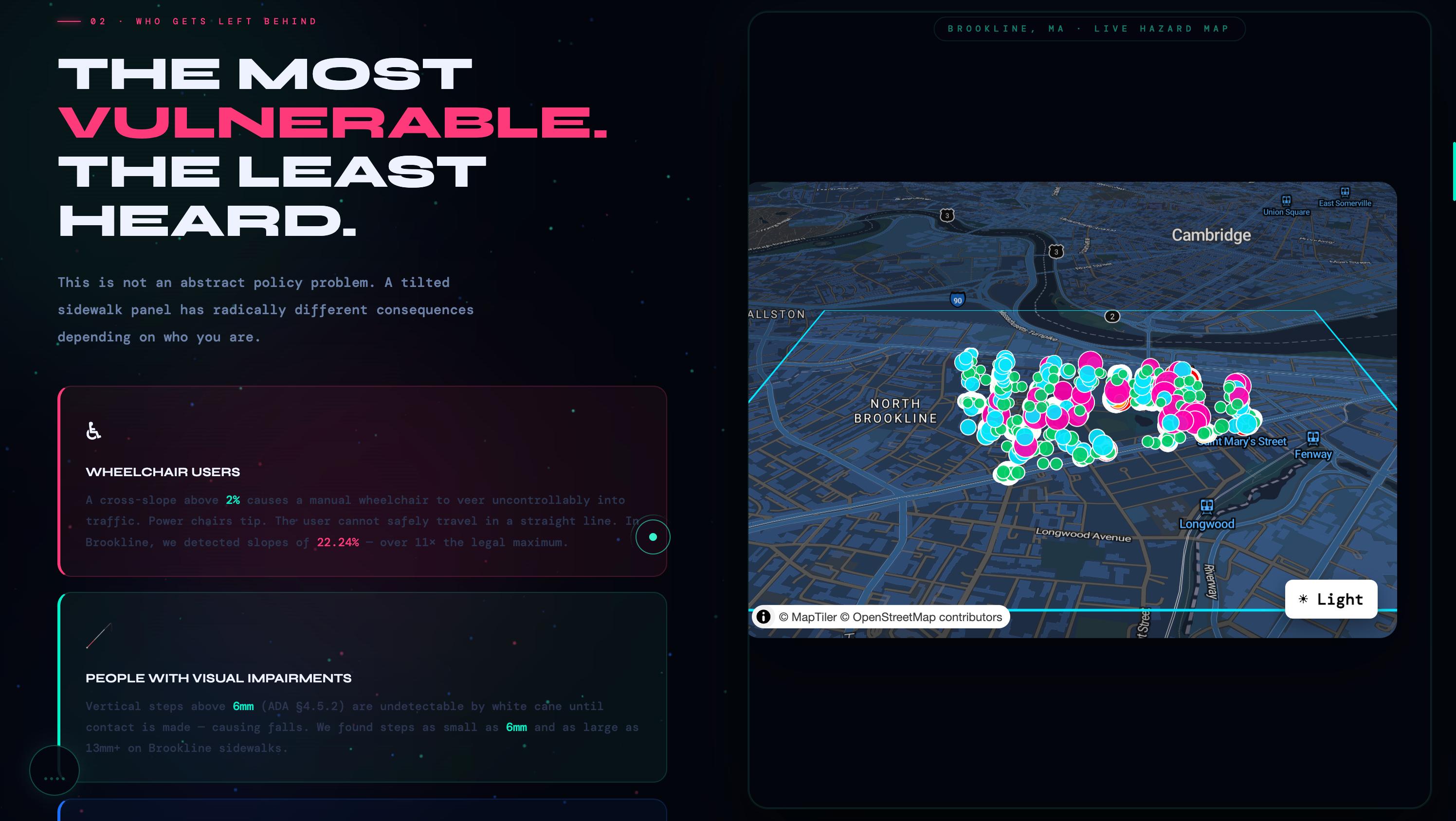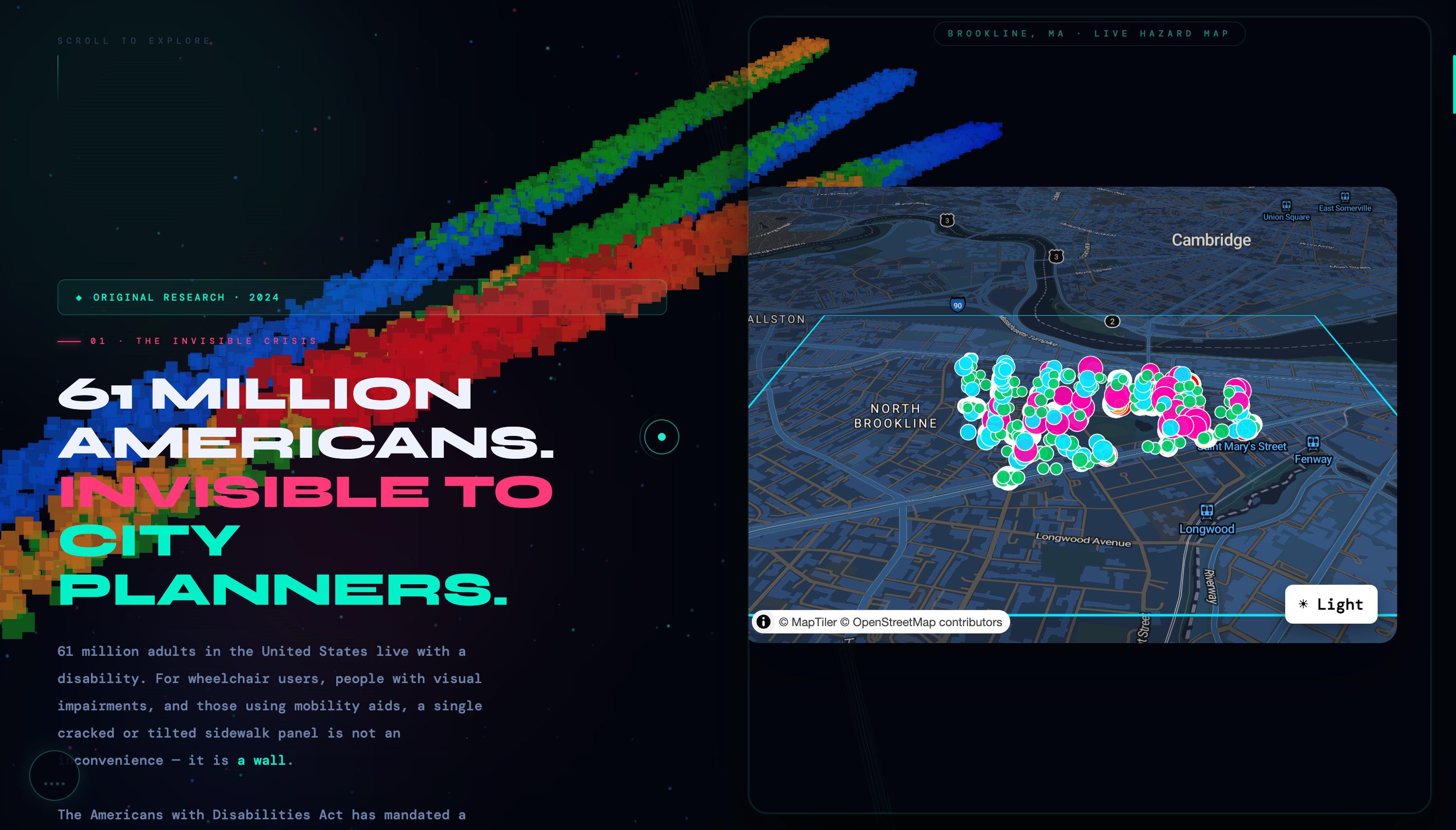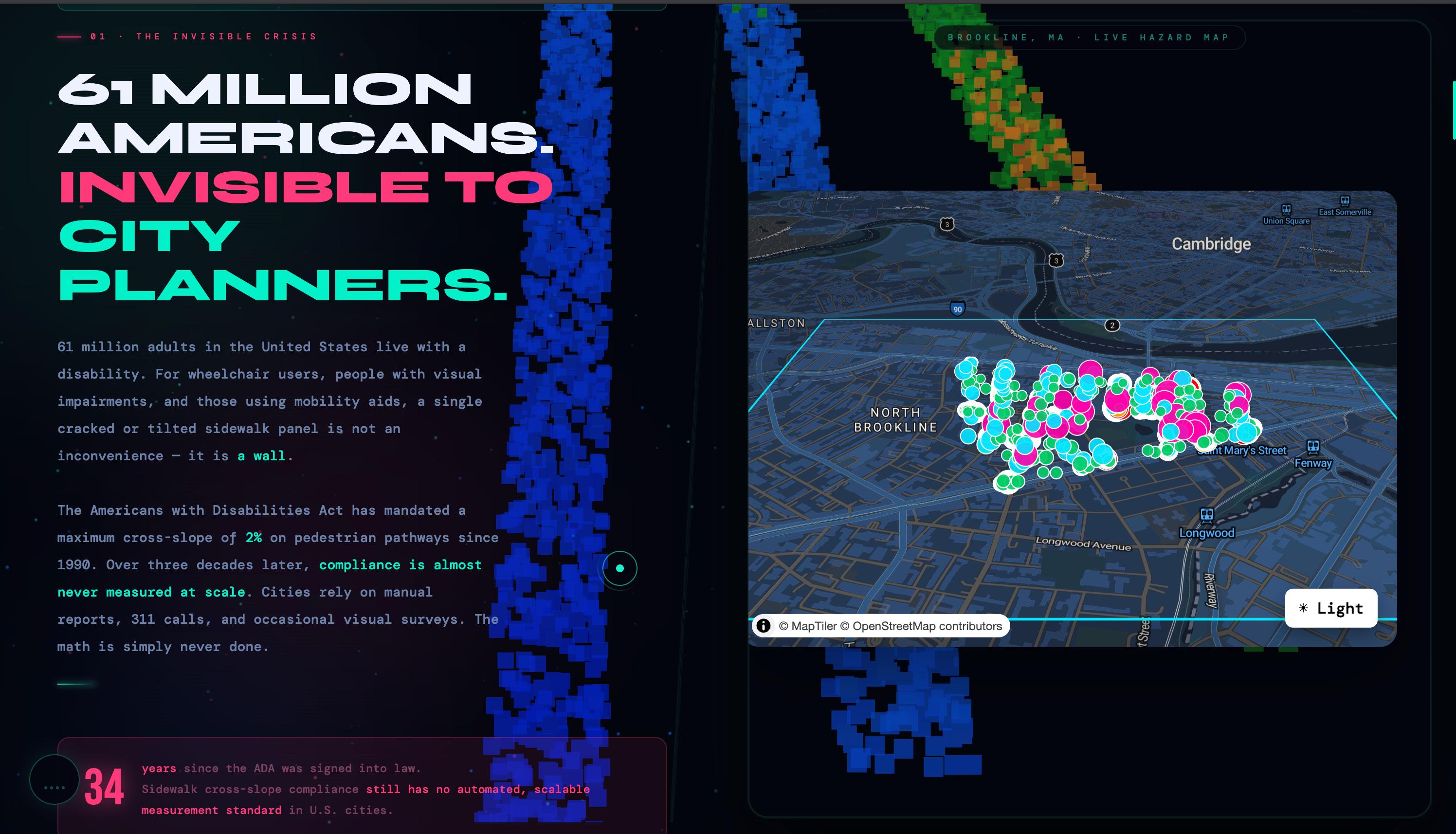 **P.A.P.I** · Point-cloud Analysis for Pathway Inclusion Brookline, MA · 2024 Built with LiDAR, mathematics, and the belief that public space should be accessible to everyone. *The data has always been there. We just finally did the math.*