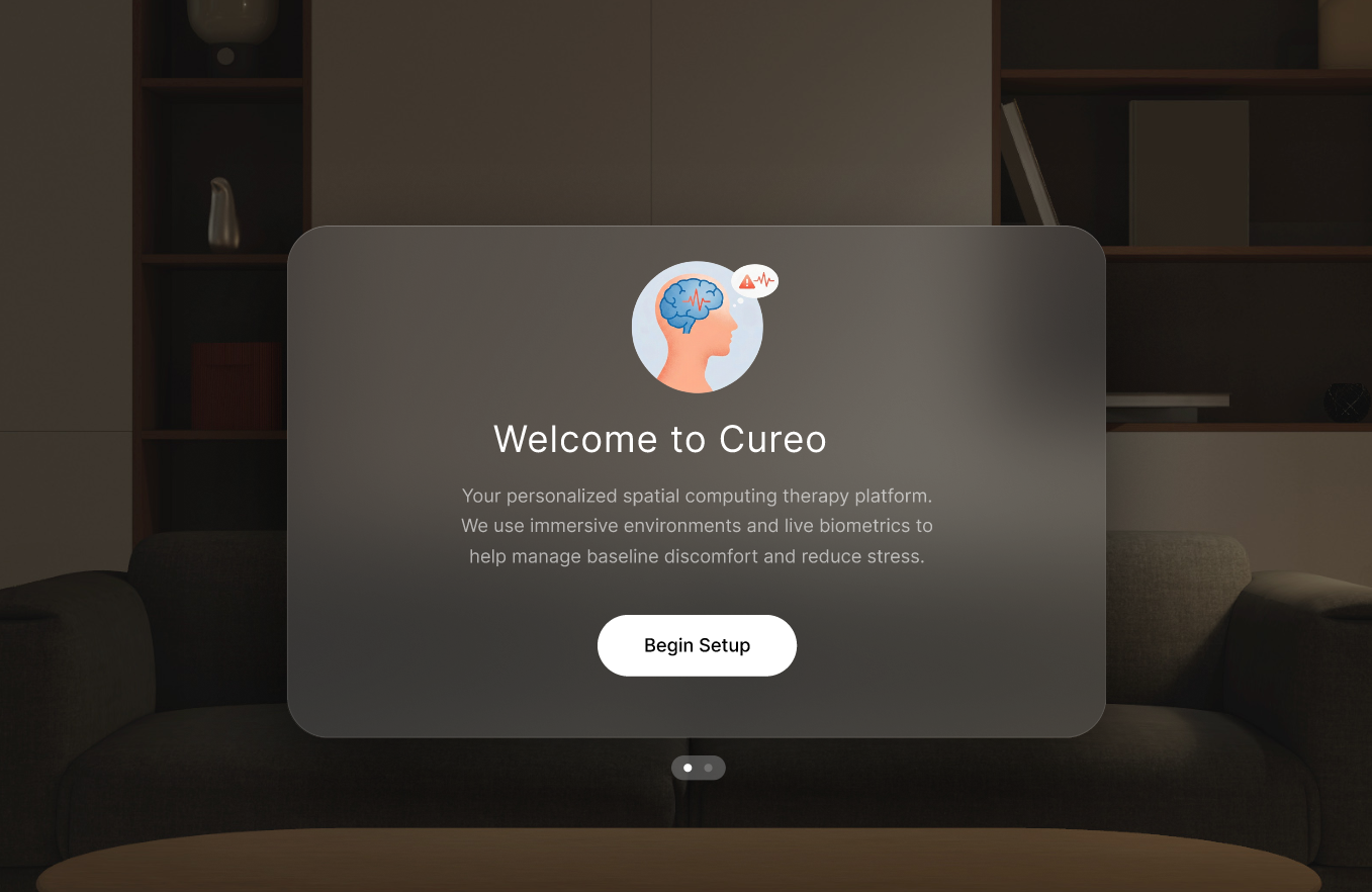 Cureo is a smart pain and emotional detection system that uses non-invasive biosensors to continuously monitor physiological signals — heart rate variability, skin conductance, facial muscle tension, body temperature, and brain wave patterns. An AI model combines these signals into a real-time pain and distress score, displayed on a color-coded dashboard (green/yellow/red) for caregivers. It also integrates with VR/AR therapeutic environments that dynamically adapt based on the patient's emotional state — calming the scene when stress rises, or introducing new activities when engagement increases.
