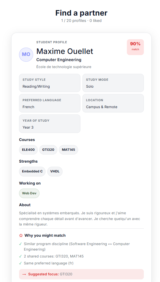We were inspired by the experience of the majority of us who do not want to study alone but don't know any good study partner. We thought about dating sites and the idea of matching students together for a good study session.